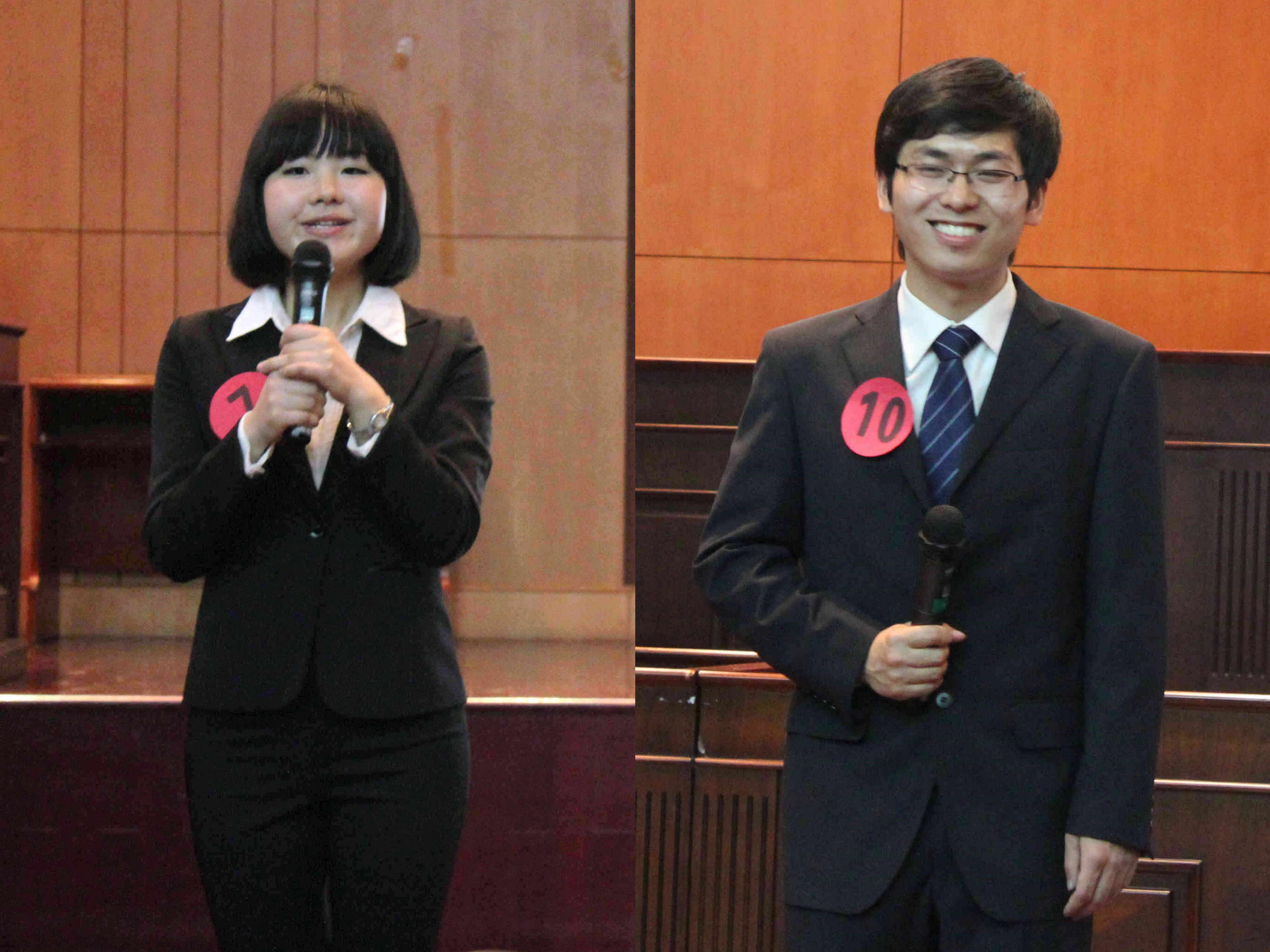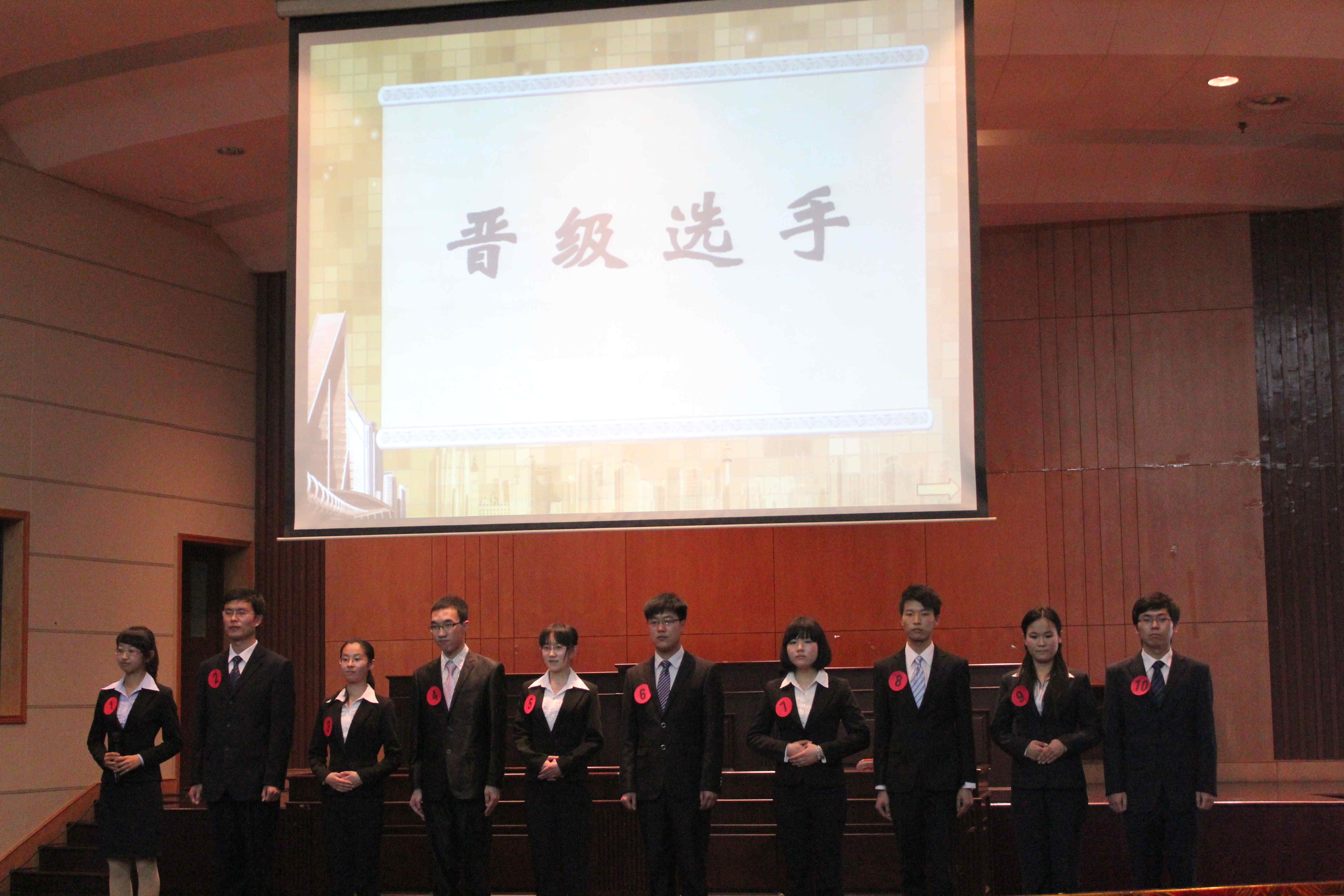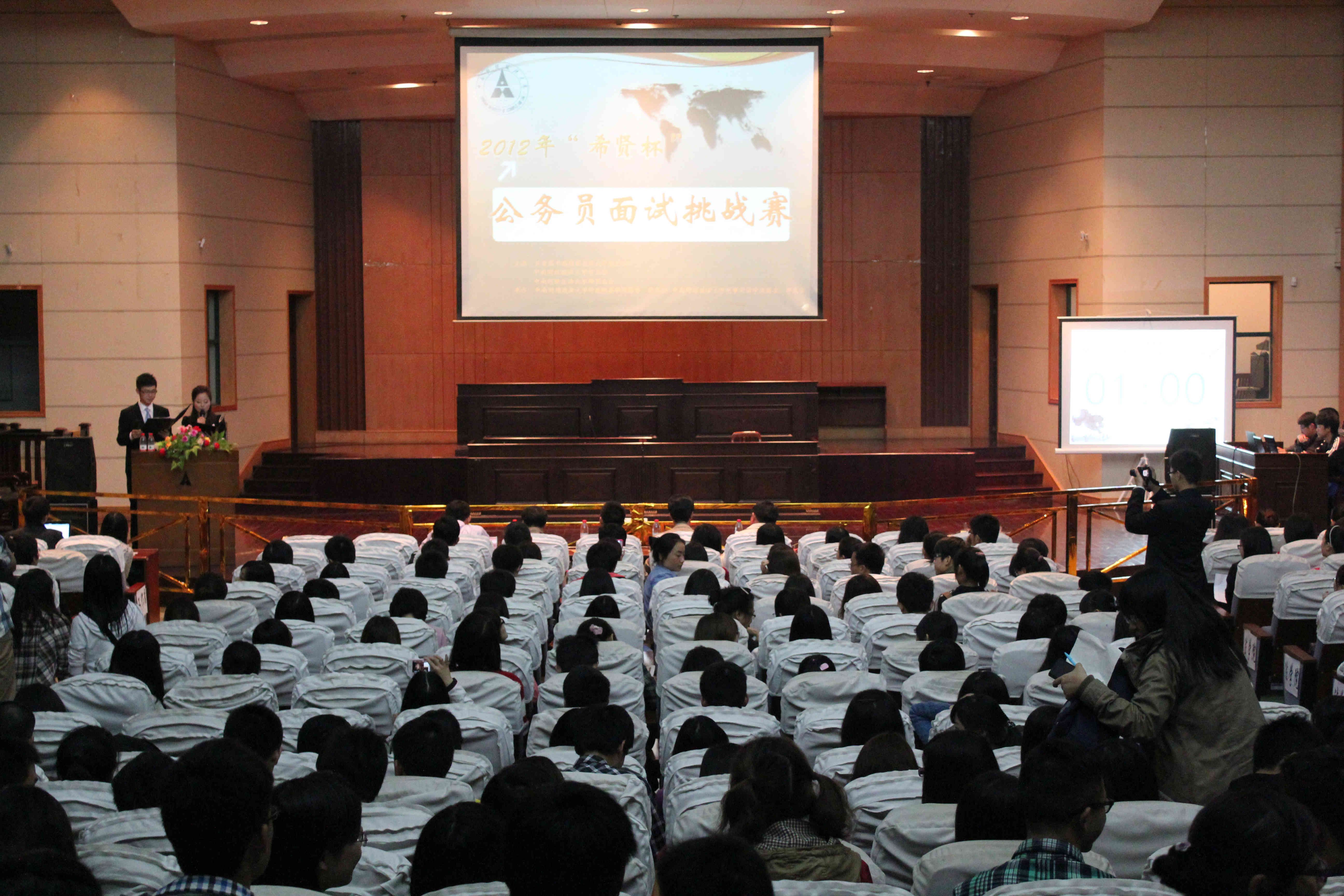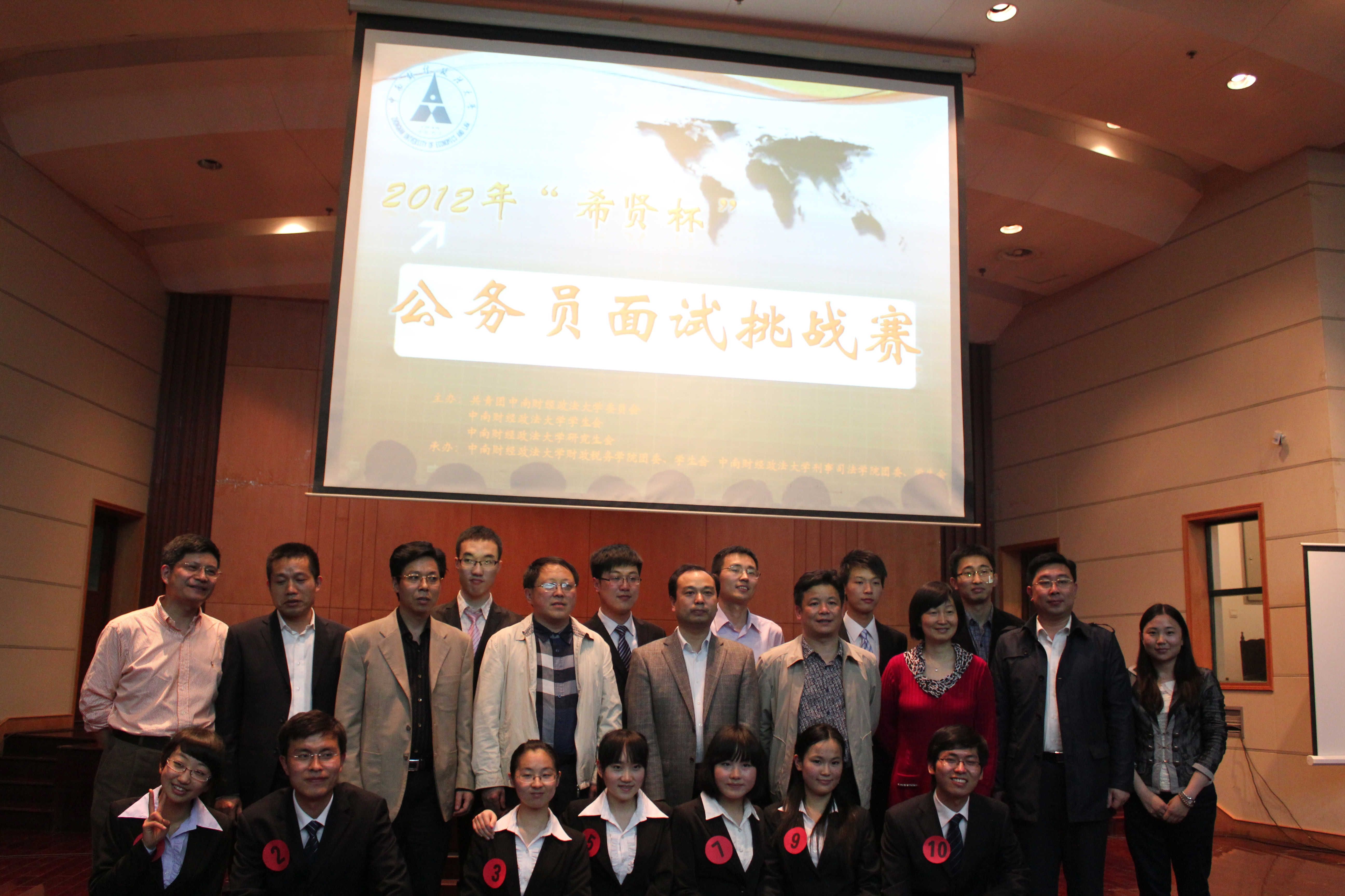 4月11日晚7点,由我校团委主办,我院与财税学院承办的“2012希贤杯公务员面试挑战赛”在文泰楼模拟法庭一举行。我院11级研究生杨新绿和09级本科生黄帅分获此次公务员面试比赛的第一和第三名。