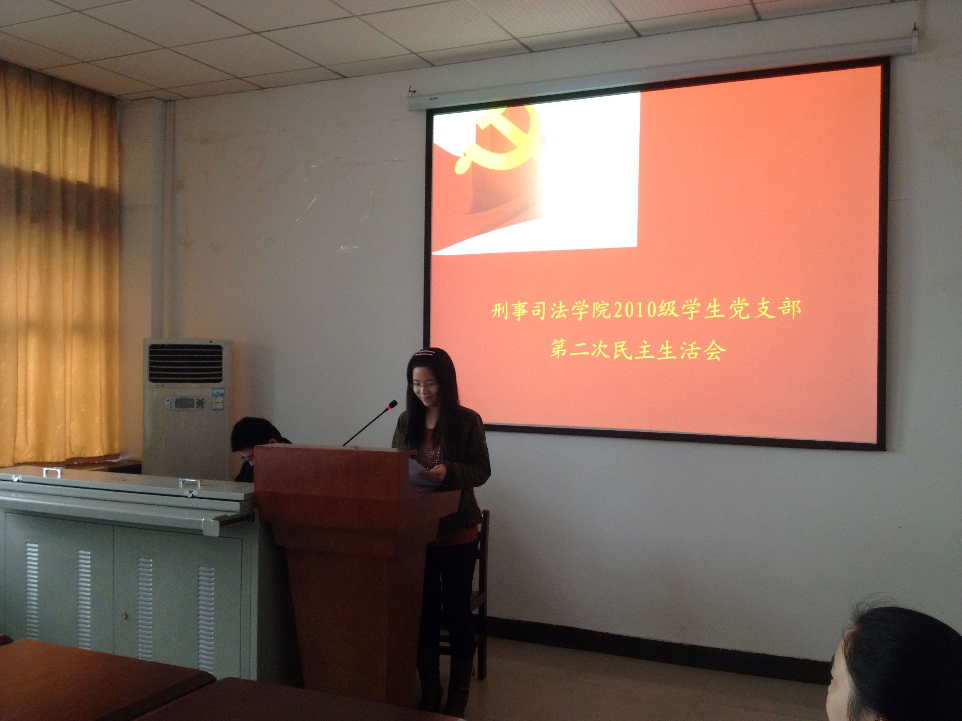 民主生活会分为“时政热点、你我建言”,“见贤思齐、反躬自省”,“民主集中、推优入党”,“以书会友、共同进步”,“年级发展、情系我心”五个板块。各位党员首先就当下“刑诉法修正案之秘密侦查权”、“温州金融试点区”等热点话题进行讨论并发表自己的见解;随后又针对“开展党员民主生活会,注重务实还是务虚更重要”这一问题展开辩论,对今后民主生活会发展方向做出规划。在反躬自省环节,大家对“如何看待大学生入党动机”、“当代高校评价机制”等与同学们切身利益相关的问题进行了讨论,各位党员纷纷发表自己见解,陈老师也鼓励大家注重个性的发展。