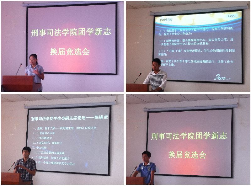 本次换届选举分为两个环节:第一环节为演讲环节,演讲形式不限,内容包括自我介绍、工作经历、及对各自部门新阶段工作的构想等;第二环节为提问环节,竞选者在演讲完毕后,接受现场提问。演讲环节中,同学们在台上侃侃而谈,或激昂或沉着,思路清晰,条理清楚,更有同学借助ppt、电子杂志等多种形式充分表达了自己的观点。同学们回顾过去,立足现在,展望未来,得到了评委们的肯定,赢得了现场的阵阵掌声。
