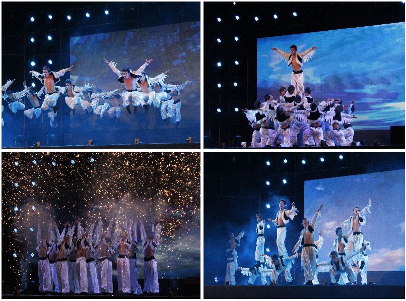 迎新晚会的现场同样洋溢着青春的激情与活力。开场舞《给力年华》在短短几分钟就点燃了现场观众的热情。校山水民乐团的表演则给大家耳目一新的感觉。第三个节目是由我院艺术团推选的校舞蹈大赛二等奖作品《翱翔》。一出场,刑司男儿就以独具创意的服装和威武挺拔的身姿赢得了台下阵阵欢呼。伴随跌宕起伏的音乐,演员以生动的表演为大家讲述着鸿雁在遭遇风暴时苦苦挣扎却始终坚持的动人故事。高难度的舞蹈动作,频繁却整齐的队形变换,深刻的舞台寓意让现场掌声不断。
