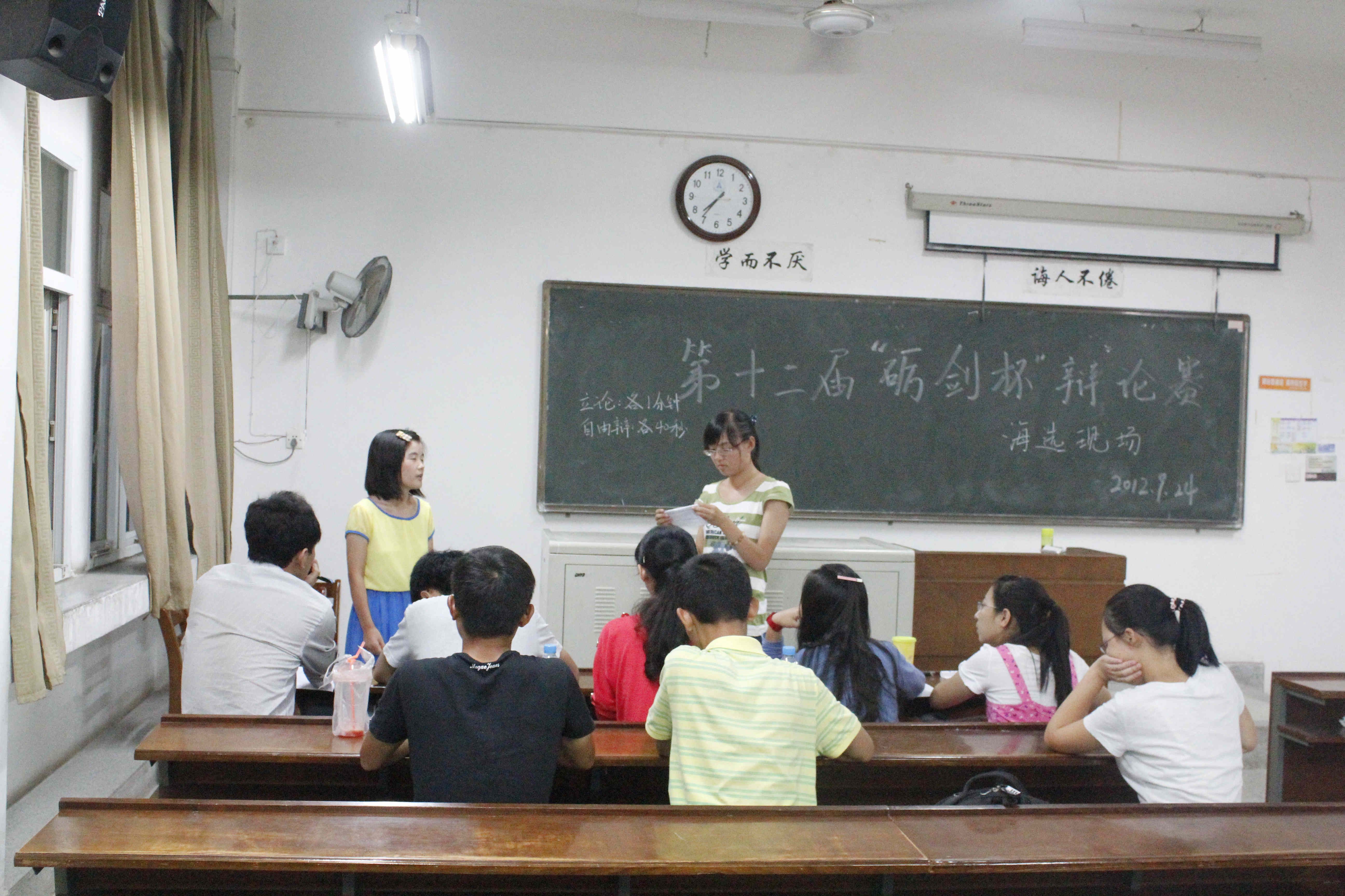 9月24日晚7点,由我院辩论队主办的“砺剑杯”海选在文澜楼201、202教室拉开帷幕。担任此次海选的评委有原演讲与辩论协会会长王盛,校“希贤杯”辩论赛冠军队成员杨益群、李博雅以及11级院辩论队队长马幸炜等。