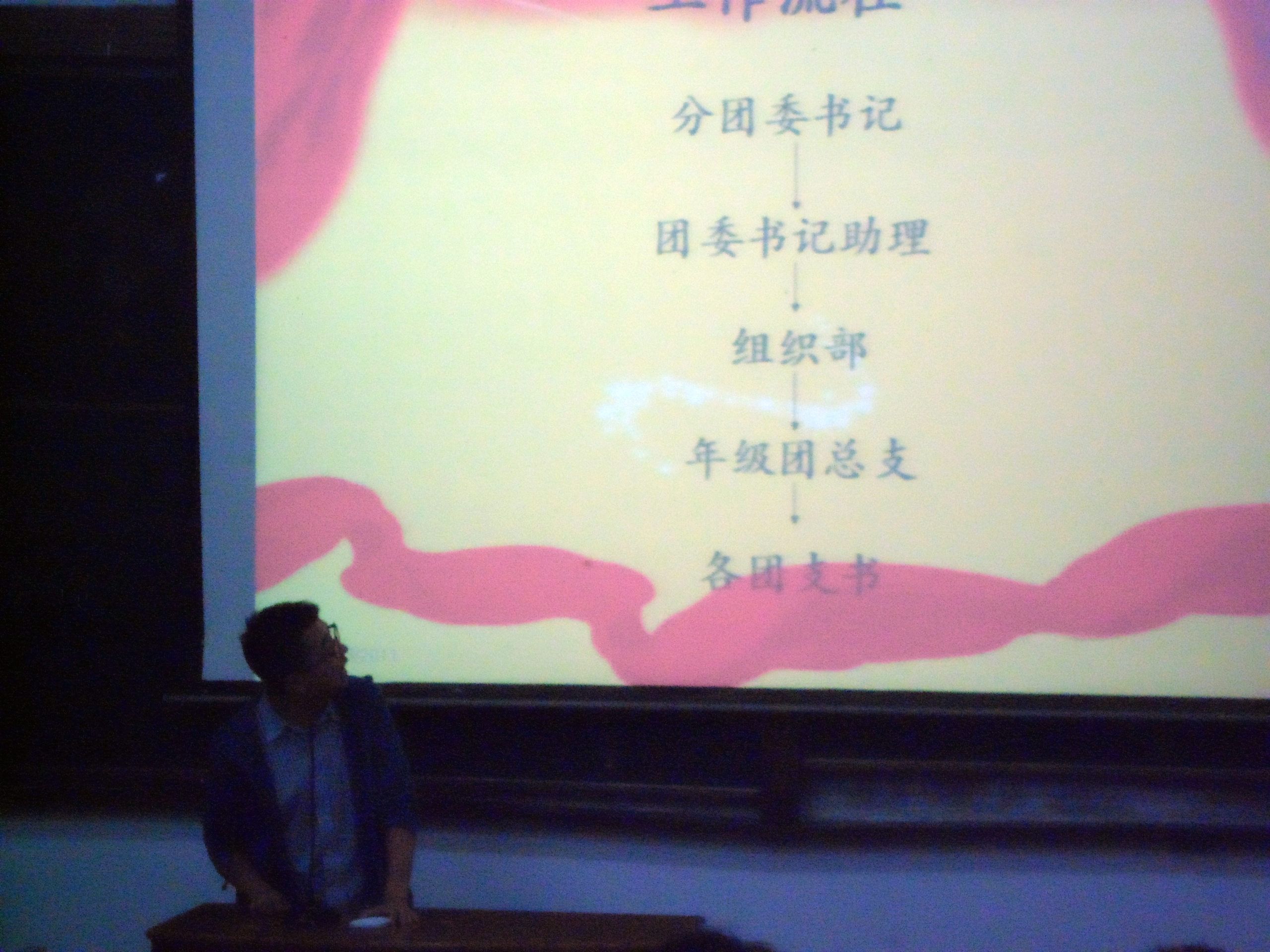 大会第二阶段是针对各班团支书和团委各部门干事日常工作的介绍环节。院团委组织部部长辛子良主要是对组织部干事进行会议记录和团支书工作手册的介绍,内容详尽充实。接着,书记助理陆 程为各班团支书讲解团支书的工作任务,她详细说明了团支书在思想引领、协调班长等工作上的重要作用。最后上台的是自律部毛亦非部长,他的讲解内容包括三大 点:一、学生手册;二、进教室流程;三、小票收集。各位部长的介绍不时赢得学员们阵阵热烈的掌声。