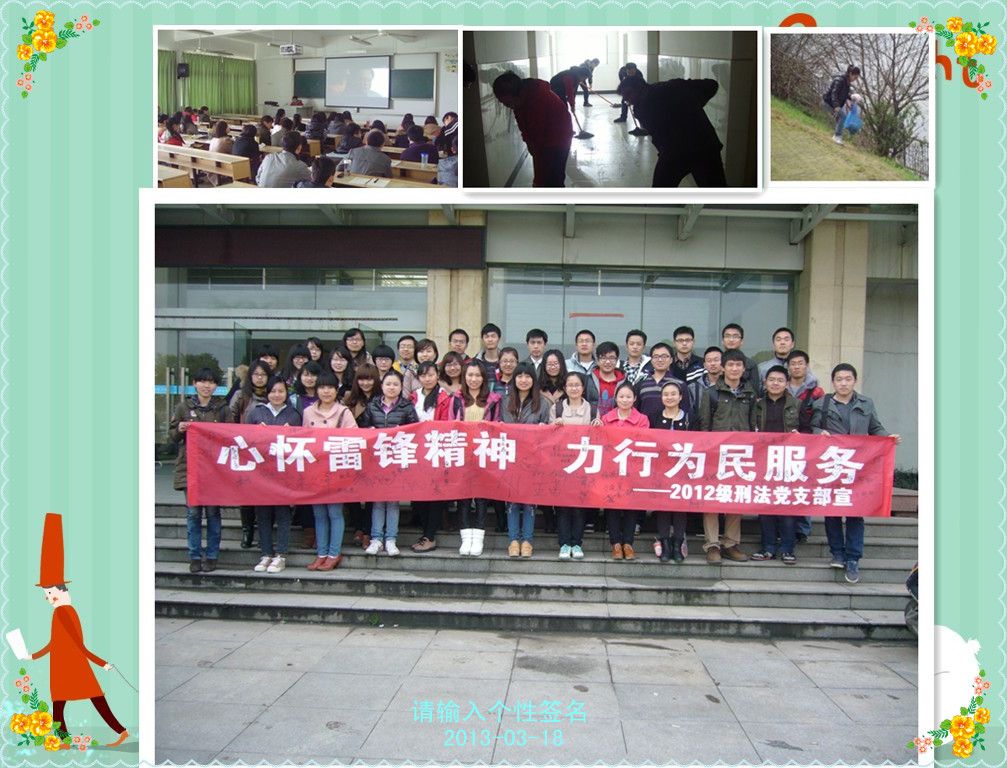 为响应学校党支部“三月雷锋月,三月学雷锋”的号召,3月18日,我院2012级刑法班硕士研究生党支部在校园内开展了以“心怀雷锋精神,力行为服务”为主题的党支部系列活动。举办此次活动的目的是为了使年轻党员们牢记雷锋精神,增强年轻党员的奉献精神,提高年轻党员的政治觉悟。
