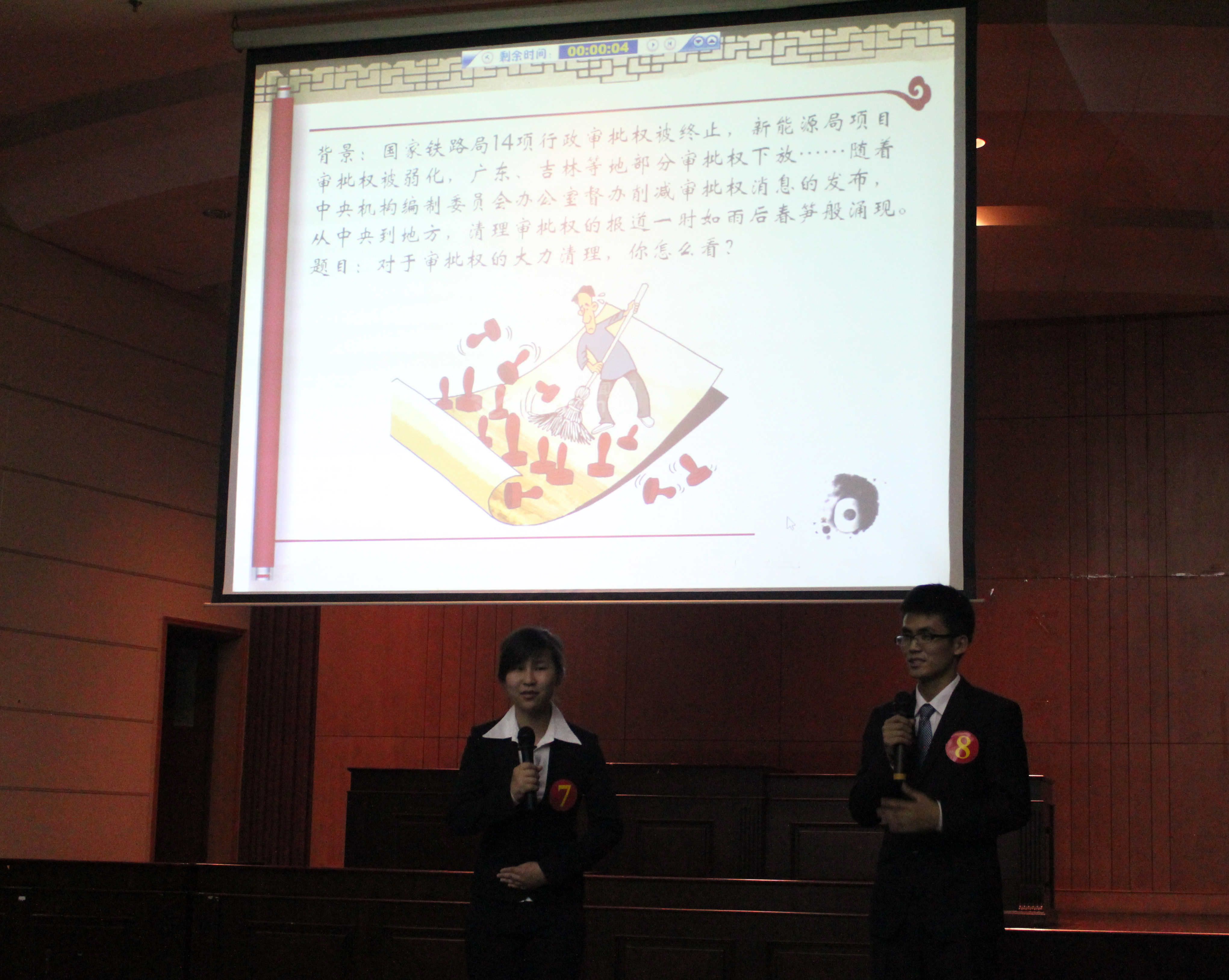 第二个环节名为“融我妙思”之情景模拟,所有选手两两组合,对大屏幕上演示的漫画以新颖独特的形式作出各自的解读。漫画材料多选用“莫言故居受热捧”、“城管暴力执法”等时政热点问题。而在有限的一分钟思考时间内,准确理解题意并组织好语言,做到完整、有见地地表达自己的观点,便要求选手密切关注时事热点问题。另外,此环节还着重考察每组的两位选手合理分工协作的能力。比赛进行到中场时,武汉市委组织部部长郑卫星先生对选手们的表现进行了点评。评委对于选手们在这一环节中采取的新闻广播、采访等一些新颖的形式给予了肯定,同时也指出选手们在看待问题时的深度和层次鲜明度还有所欠缺。而对每一位选手分别细致的点评,使得参赛选手对自己的表现有了更加客观的认识,这对选手们接下来的表现是大有裨益的。然而比赛进行至第二个环节,只有前六名成功晋级到下一环节之中。我院参赛选手遗憾地与晋级机会失之交臂,但最年轻的7号选手、我院职侦1201班的刘欣培同学的表现也体现了我院学子的不凡风采。