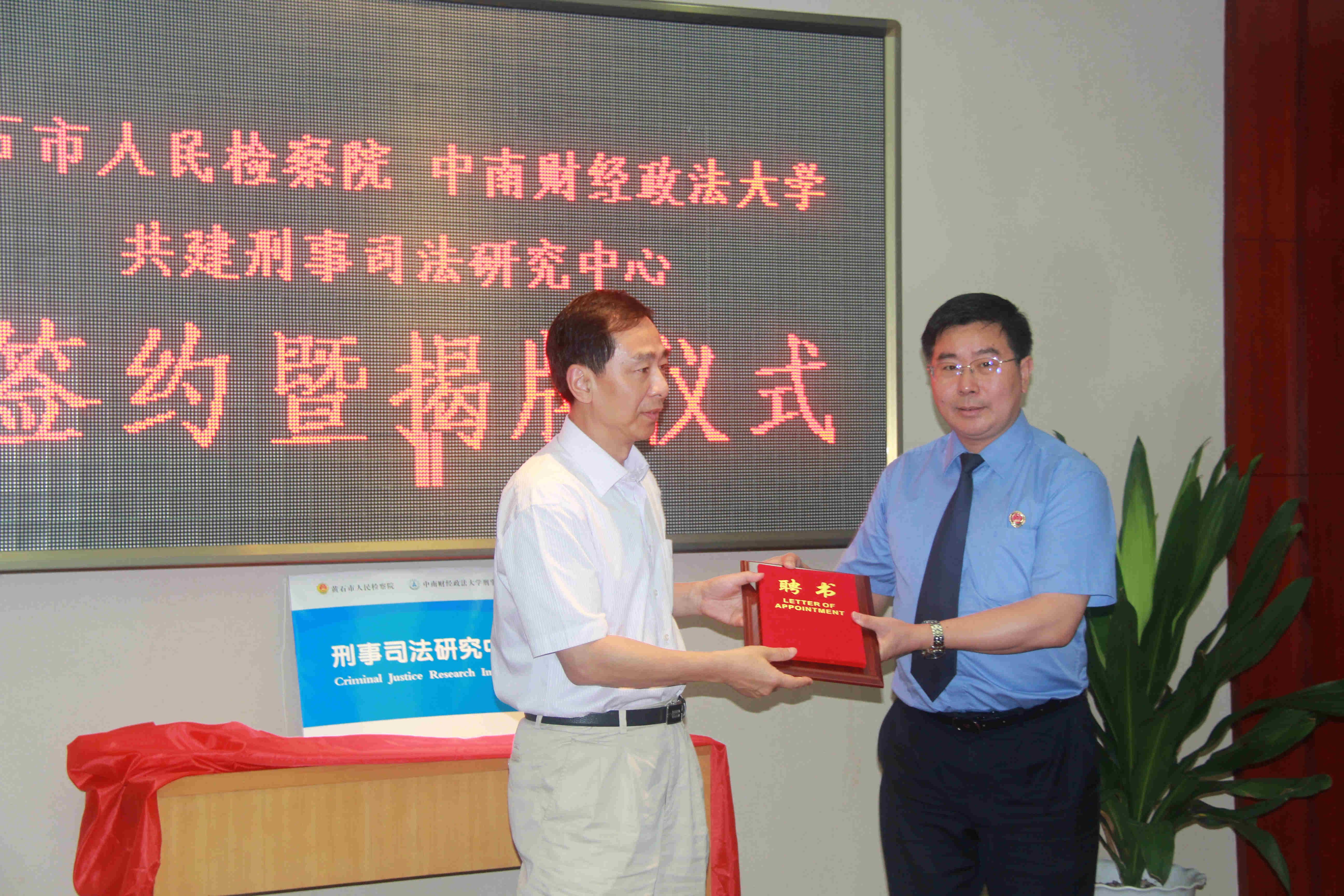 夏勇院长在致辞中代表刑事司法学院对黄石市人民检察院欢迎与支持表示感谢,认为这是新的教研合作模式,希望通过这个模式为我院的教学与科研的提供新的平台,在简要介绍我院目前的办学基本情况后,夏勇院长也表示欢迎黄石市检察系统的领导与同志来我院指导工作及共同开展学术研究。最后,夏勇院长向杨武力、秦国文两位检察长授予我院兼职教授聘书,并与杨武力检察长共同主持了签约与揭牌仪式。在热烈的掌声中仪式结束,新的教研合作模式——刑事司法研究中心就正式运行。