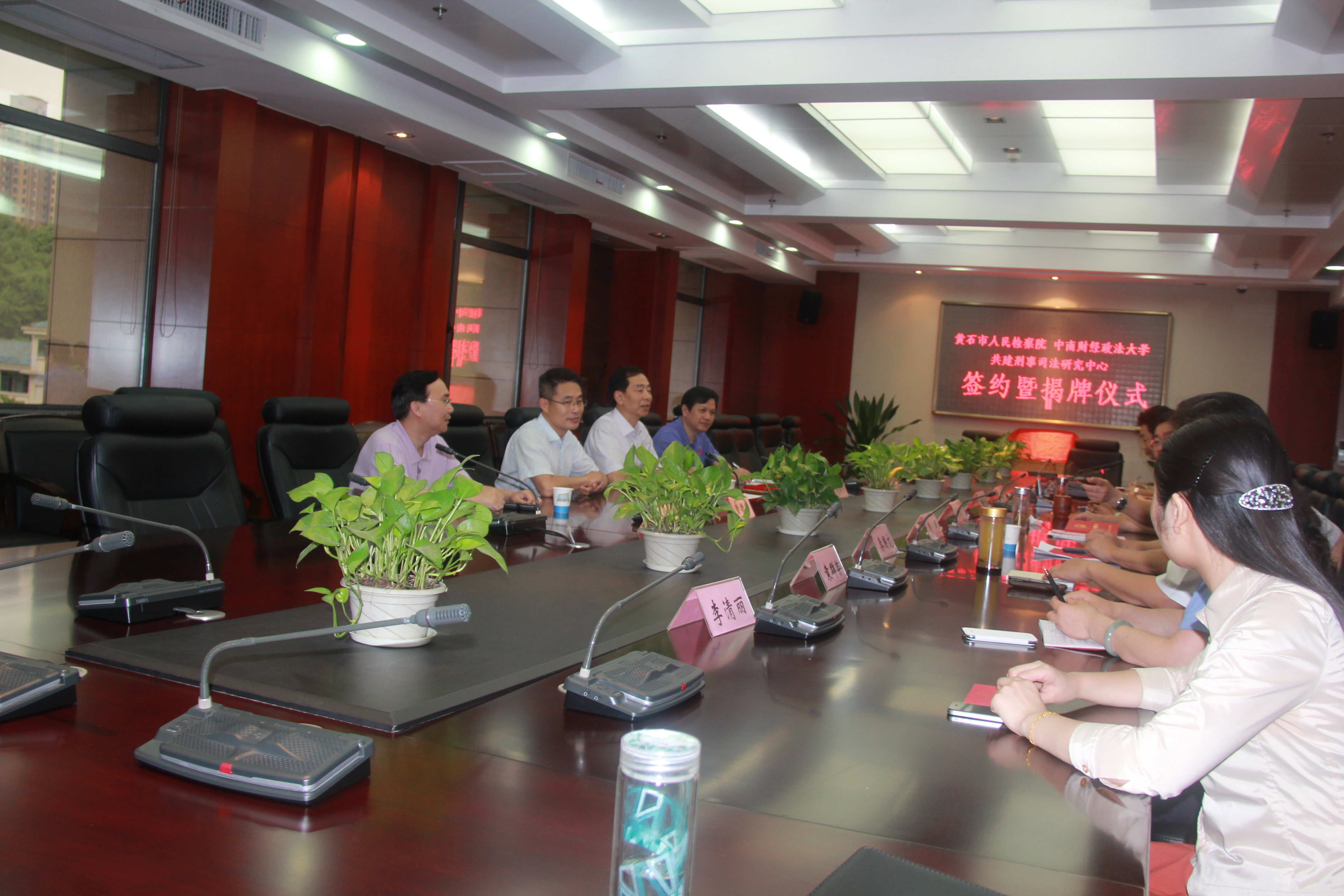 黄石市人民检察院杨武力检察长、秦国文副检察长、郭西泽副检察长等院领导对我院莅临表示热烈欢迎。在签约与挂牌仪式上,杨武力检察长代表黄石市检察系统对共建刑事司法研究中心表示大力支持,认为这是新的检校合作机制,借助这个平台,刑事司法学院的师生可以到我院调研实习,建立理论联系实际的基地;检察院将借助中南财经政法大学的理论智慧,通过举行专家讲学,个案研讨等方式深入合作内容。