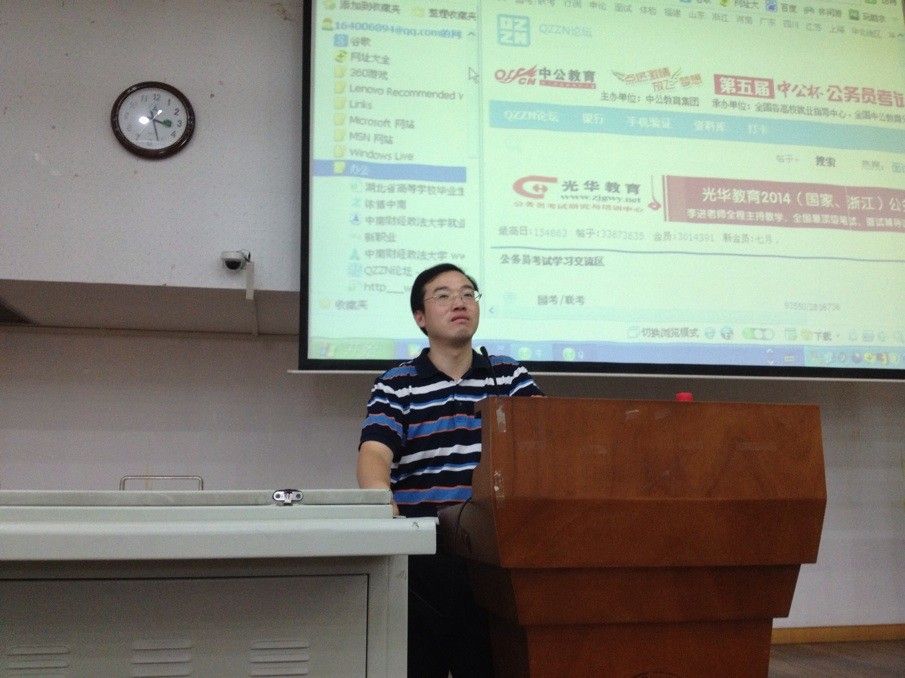 余老师首先对今年的就业形势进行了分析。由于全国乃至世界经济增长放缓,给13级毕业生就业造成了极大的困扰,同时今年的毕业生人数较往年有较大增幅,竞争更加激烈,余老师称13年为“最难就业季”。然而,另一方面随着我国经济逐渐复苏,就业岗位和招聘单位有所增加,这对我们来说是一个积极信号。余老师指出,我院13级毕业生实际就业率约为84﹪,其中通过公务员考试的占34.91﹪,进国企的占12.73﹪,考研的占19﹪。通过与法学院进行横向比较并结合我院的专业特点,他认为公务员考试是我院毕业生的主要流向,而考研、进企业次之。但余老师建议我们应该把握住各企业招聘的节奏,充分利用双学位使就业方向多元化,不做“悲催的毕???rdquo;。