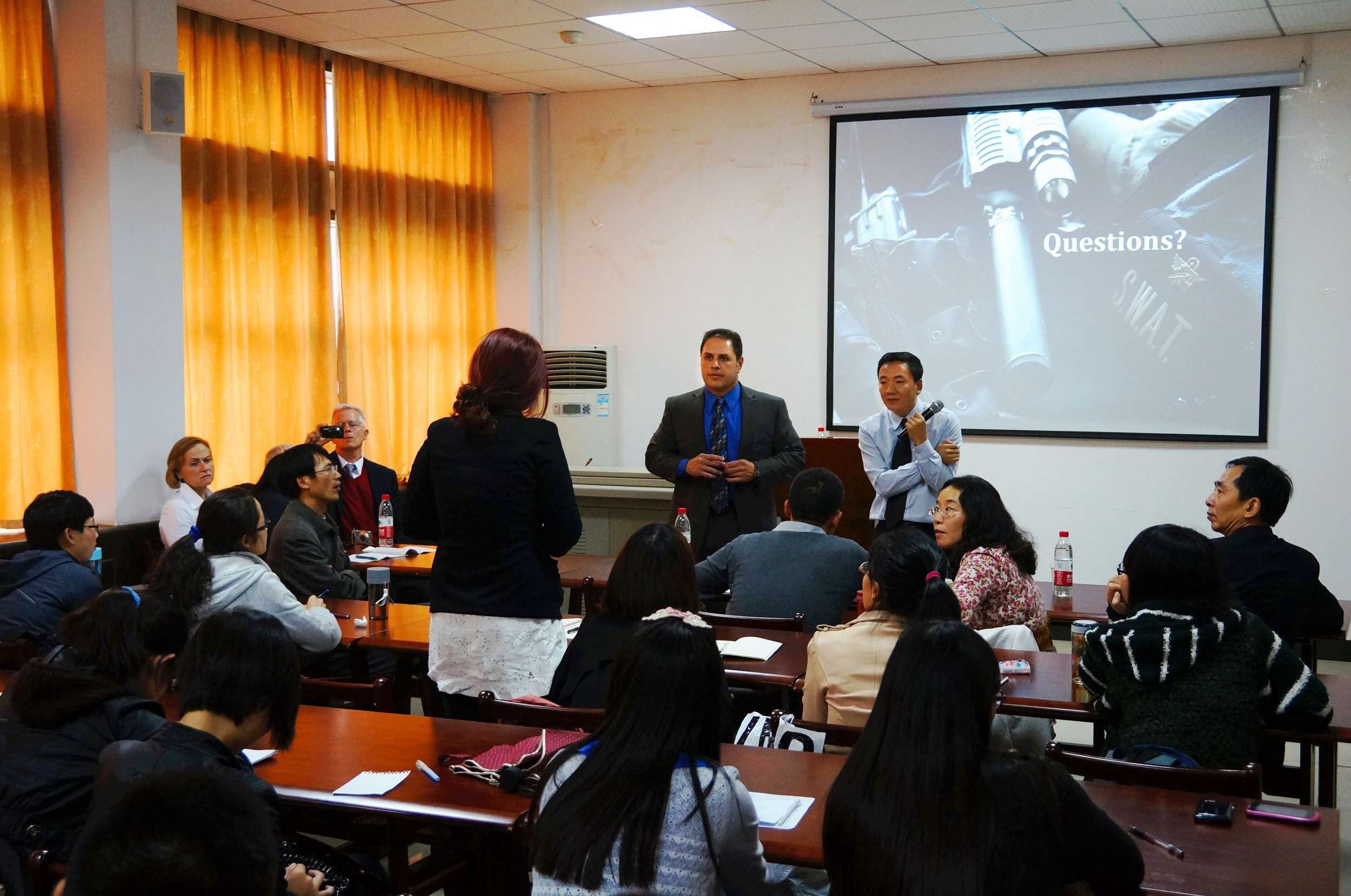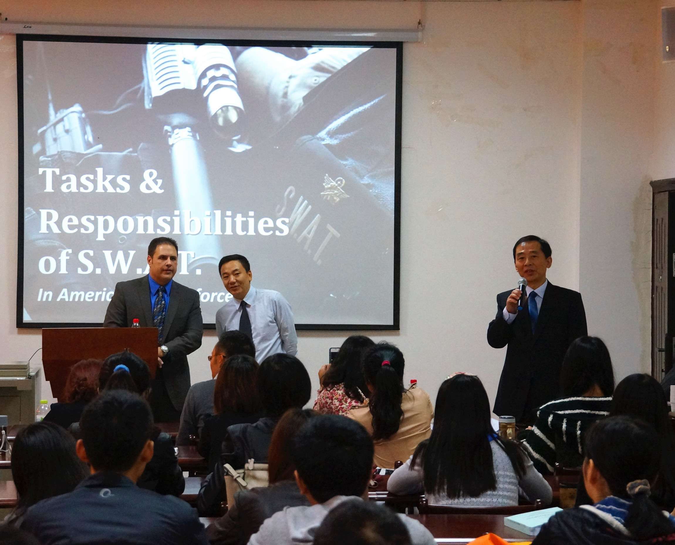 10月31日下午两点整,美国刑事司法周系列讲座第四讲在文治楼二楼会议室举行。本次讲座的主讲嘉宾是来自美国德克萨斯州韦科市警局的特警队队长Jared Lee Wallace先生,其演讲的主题为美国特警在执法中的工作与责任(Tasks & Responsibilities of S.W.A.T.)。我院院长夏勇教授、副院长苏彩霞教授及舒玲华、徐慧等教师出席了本次讲座。杨立云副教授担任本次讲座的同步翻译。