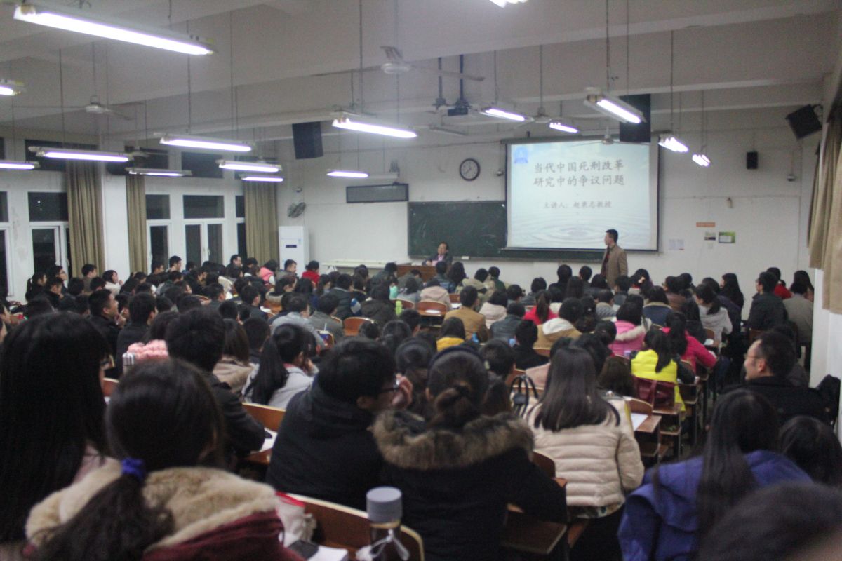 为进一步提升师生学术水平,学习刑法学前沿科研成果与学术观点,12月6日晚7时30分,我院特邀请赵秉志教授于文澜楼110教室进行讲座。讲座正式开始前,我校副校长陈小君教授对赵教授进行了介绍并代表全体师生表示热烈的欢迎。赵教授是北京师范大学刑事法律科学研究院暨法学院院长、国际性法学协会副主席暨中国分会主席、中国刑法学研究会会长及最高人民法院特邀咨询员。此次带来的讲座主题为“当代中国死刑改革研究中的争议问题”。