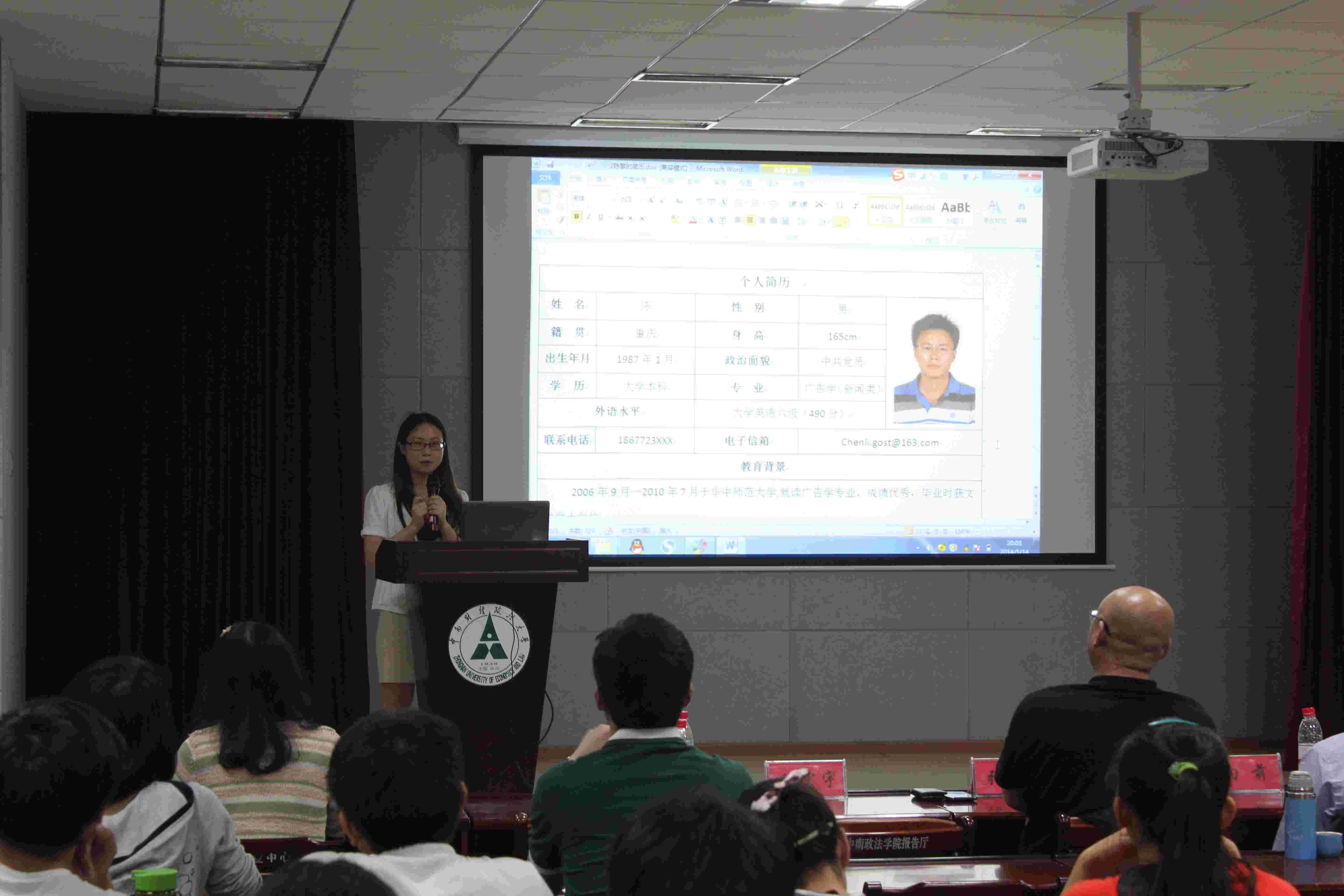5月14日晚7点整,由就业指导中心主办,我院承办的破“简”而出简历设计大赛之培训讲座于文潭楼308火热举行。莅临本次讲座的有就业指导中心罗先锋副主任、我院党委副书记向前老师、万学教育集团张强副总裁以及万学教育集团的陈龙老师和魏宏宇老师。