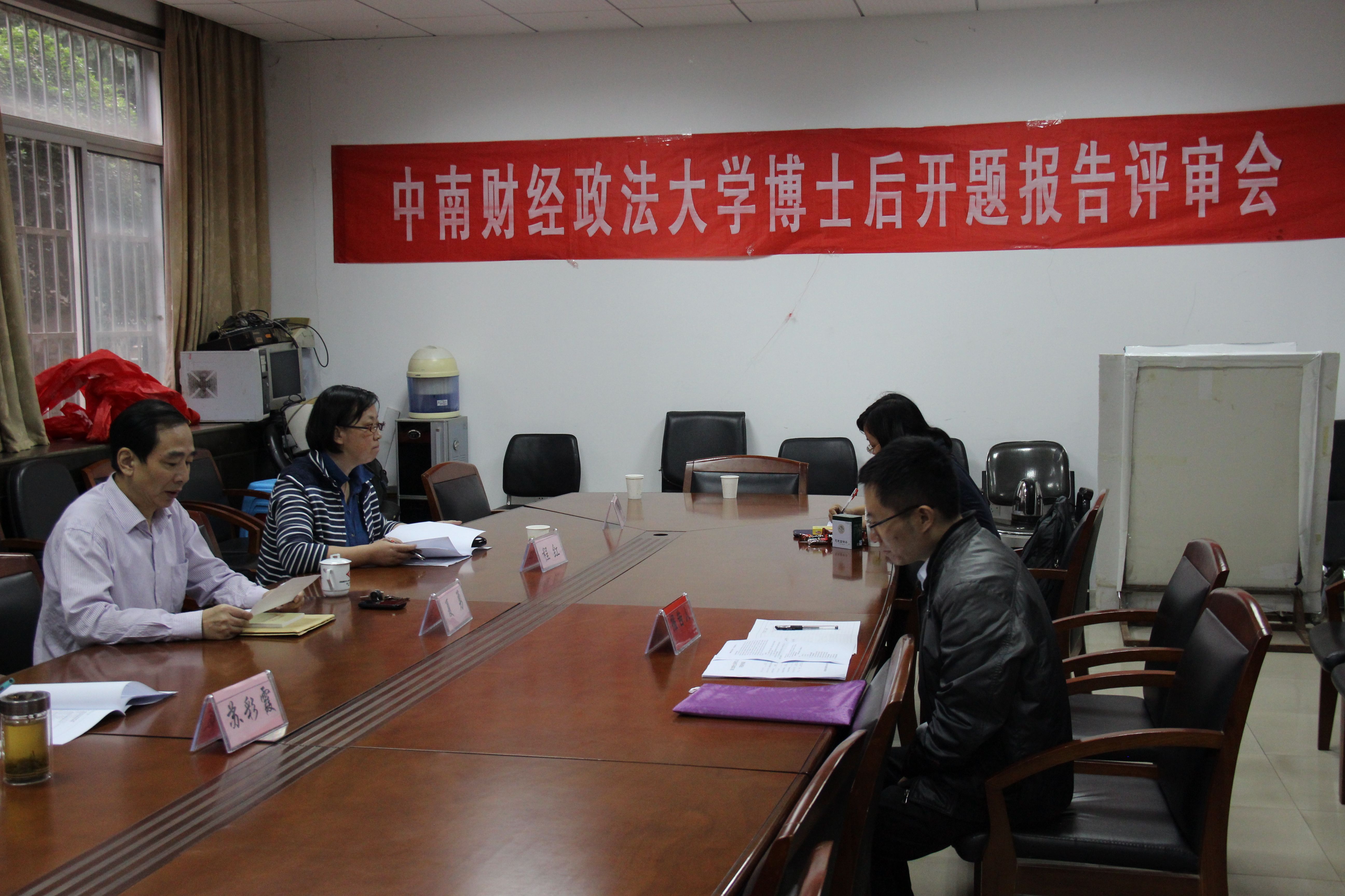 2014年10月16日下午,法学博士后流动站杨柳博士的开题报告评审会在文治楼1楼会议室顺利举行。参加评审会的有:中南财经政法大学刑事司法学院夏勇教授、苏彩霞教授、王良顺教授、周详教授、程红教授、合作导师齐文远教授以及博士后管理办公室徐良生主任。开题评审会由刑事司法学院院长夏勇教授主持。