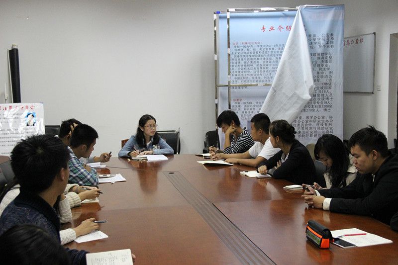 二〇一四年十月二十八日中午十二点,刑事司法学院在文治楼一楼会议室召开了“两访两创”学生代表访谈会,此次会议由14级辅导员赵轶老师主持,来自司法班、侦查班、治安班、边管班和职侦班的大一新生代表参加了本次会议。