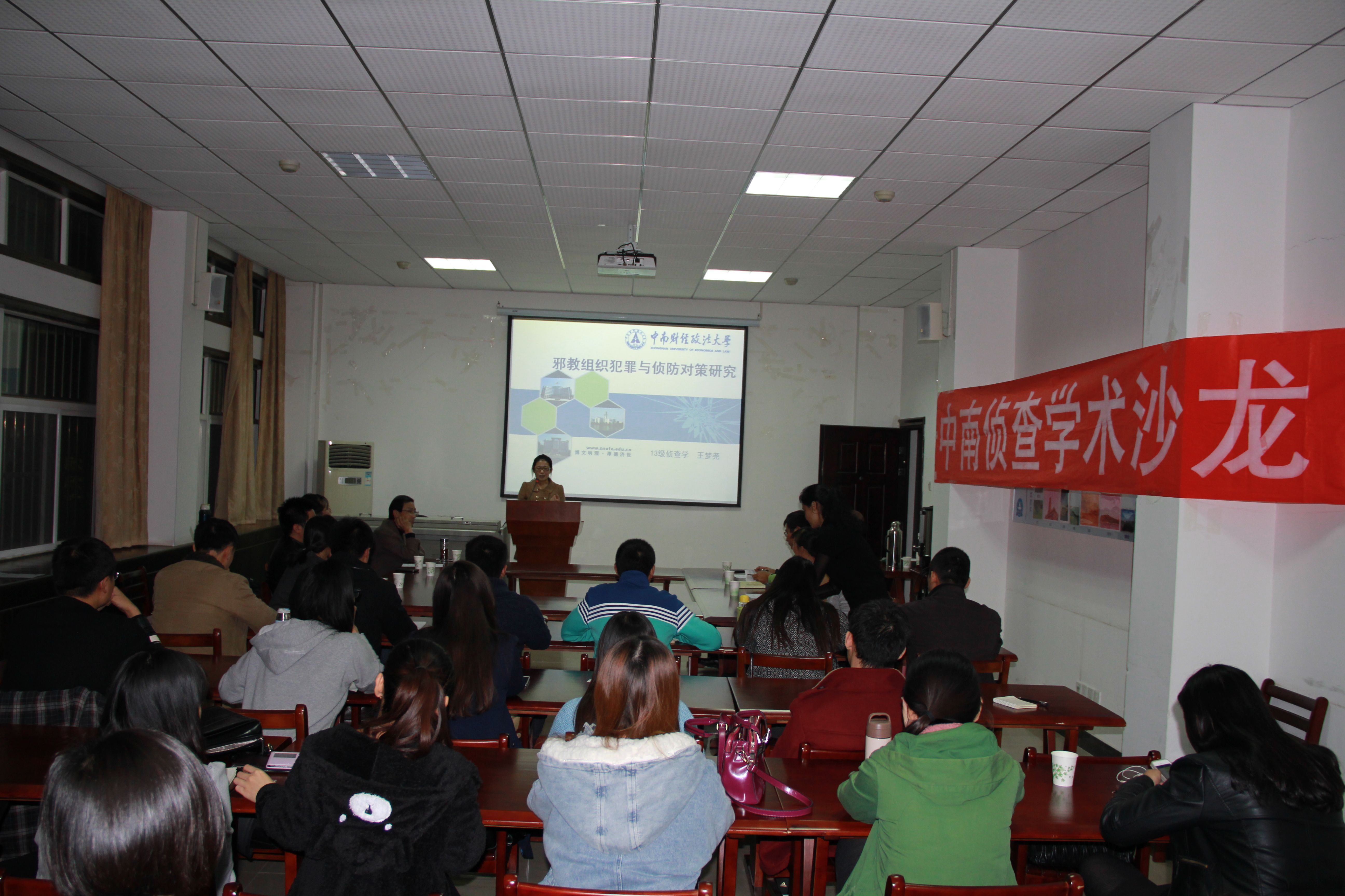 11月13日晚7:00,我院“刑走中南”系列之中南侦查学社第十一期学术沙龙活动在文治楼二楼会议室顺利举行。本次学术沙龙活动以“邪教组织犯罪与侦防对策”为主题,分别由2013级侦查学硕士研究生程博和王梦尧担任主讲人,由刑法学刘代华博士作为点评人参与此次活动,法律硕士教育中心主任、侦查学博士生导师杨宗辉教授、刑事司法学院董邦俊教授、彭峰副教授、舒玲华副教授以及其他各学科老师作为活动嘉宾和侦查学博士、硕士研究生也积极到会参加了此次活动,本次活动由周睦棋老师主持。