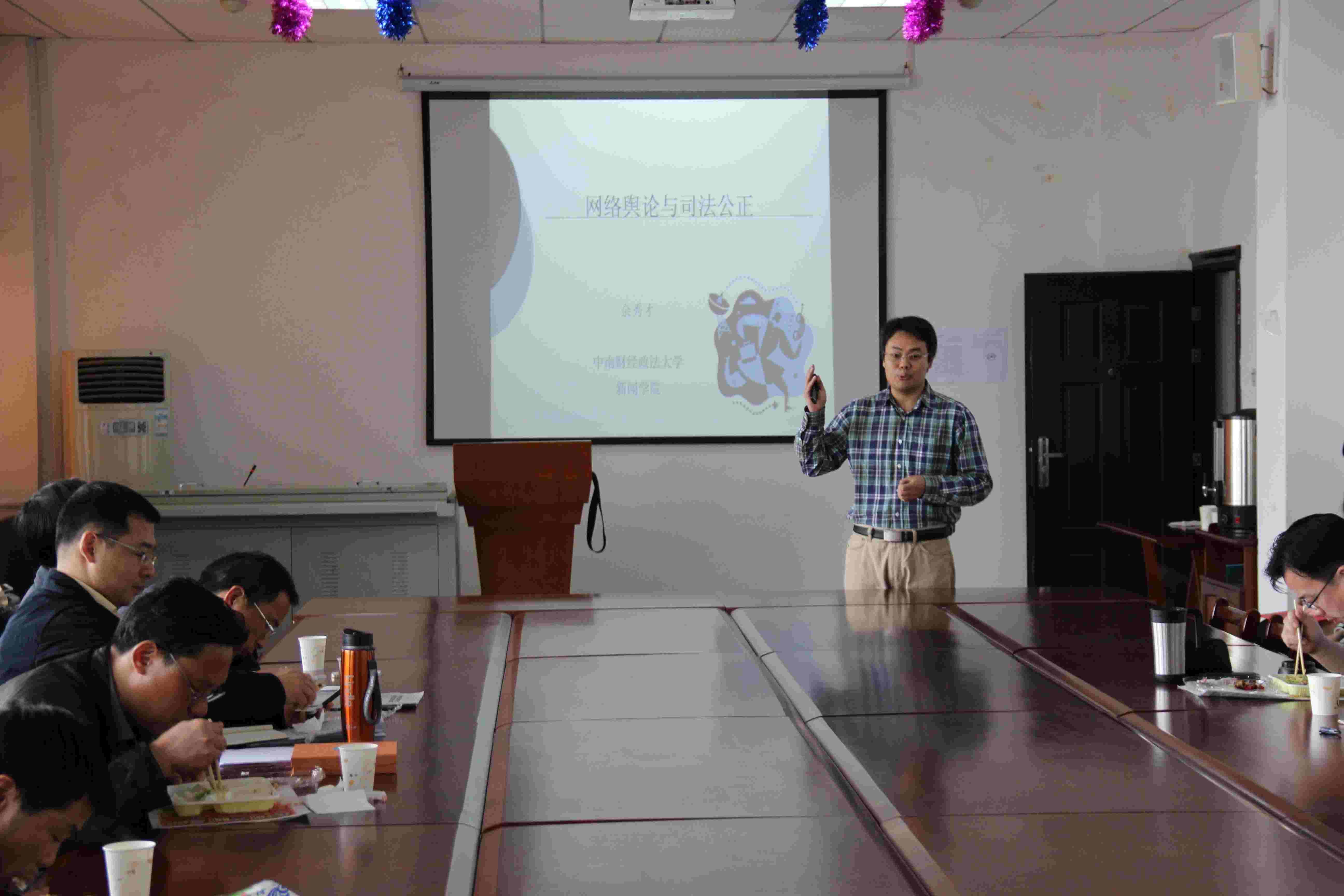 4月23日中午,我院第十二期学术午餐会在文治楼二楼会议室举办。本次学术午餐会以“网络舆论与司法公正”为主题,由新闻与文化传播学院余秀才副教授主讲,杨柳老师主持。我院院长夏勇教授、副院长童德华教授、郭泽强副教授、周凌副教授等刑法与公安学科老师及部分博士生、研究生、本科生参加了此次活动。