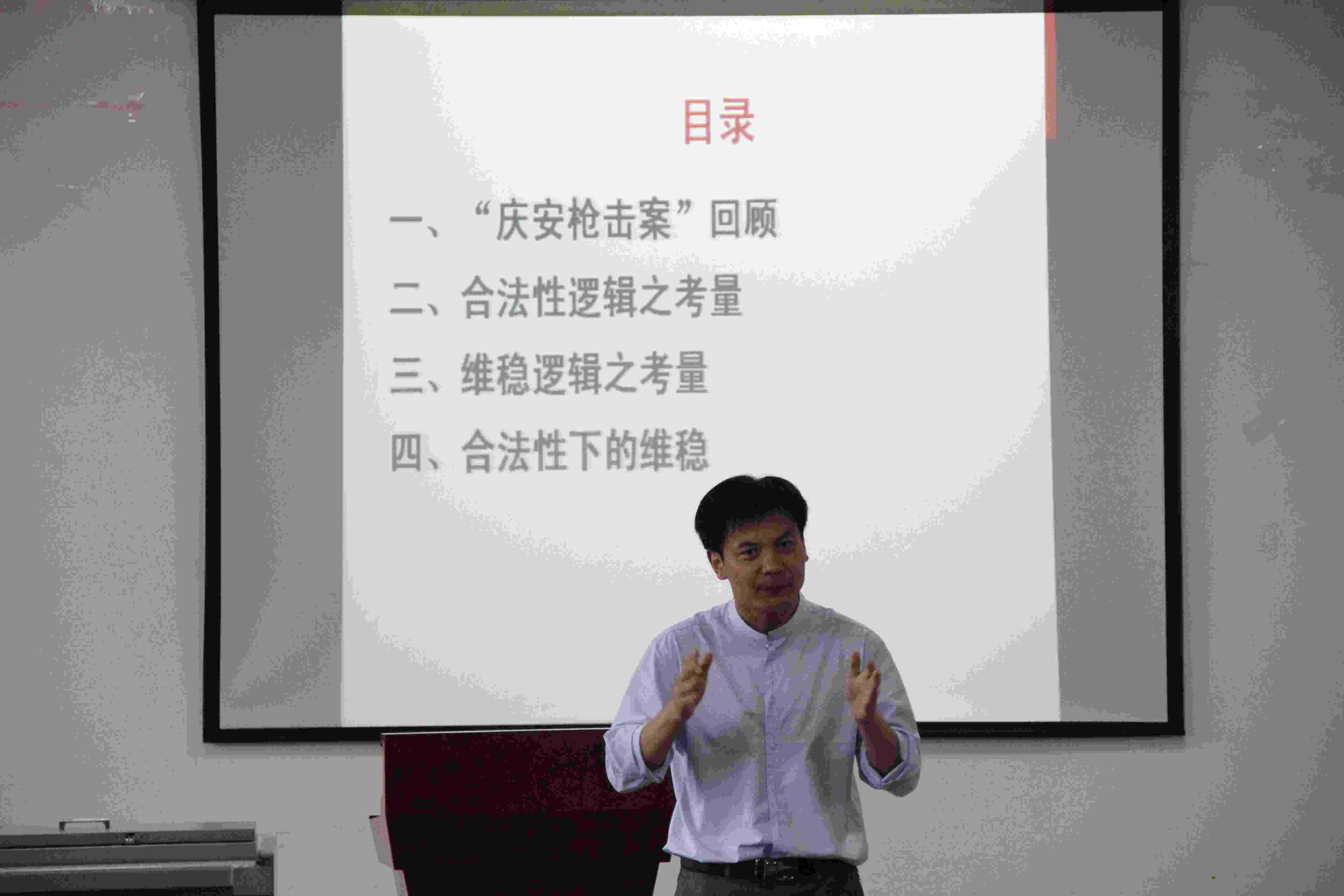 戚建刚教授的演讲从合法性逻辑与维稳逻辑的博弈角度展开。首先,他指出,在展开案件之前有一个理论预设,即合法性逻辑与维稳逻辑存在差别。二者的差距在于对待法律的态度不同,在对待社会公众和行为相对人时,这就可能造成一定的偏差。随后,戚教授带领我们回顾了“庆安”枪击的案件始末,并从合法性逻辑和维稳逻辑的角度对此案进行考量。从合法性逻辑考量,戚教授列举了案件中六个值得质疑的不合法之处,如县长给民警行为定性问题、李乐斌使用武器存在非法嫌疑问题等;从维稳逻辑考量,戚教授提到,在舆论压力下,事件尚未调查,维稳逻辑却已经启动,这是违反刑法对程序正义的价值追求的。最后,戚教授认为刚性维稳体制难以维系,倡导回归合法性。