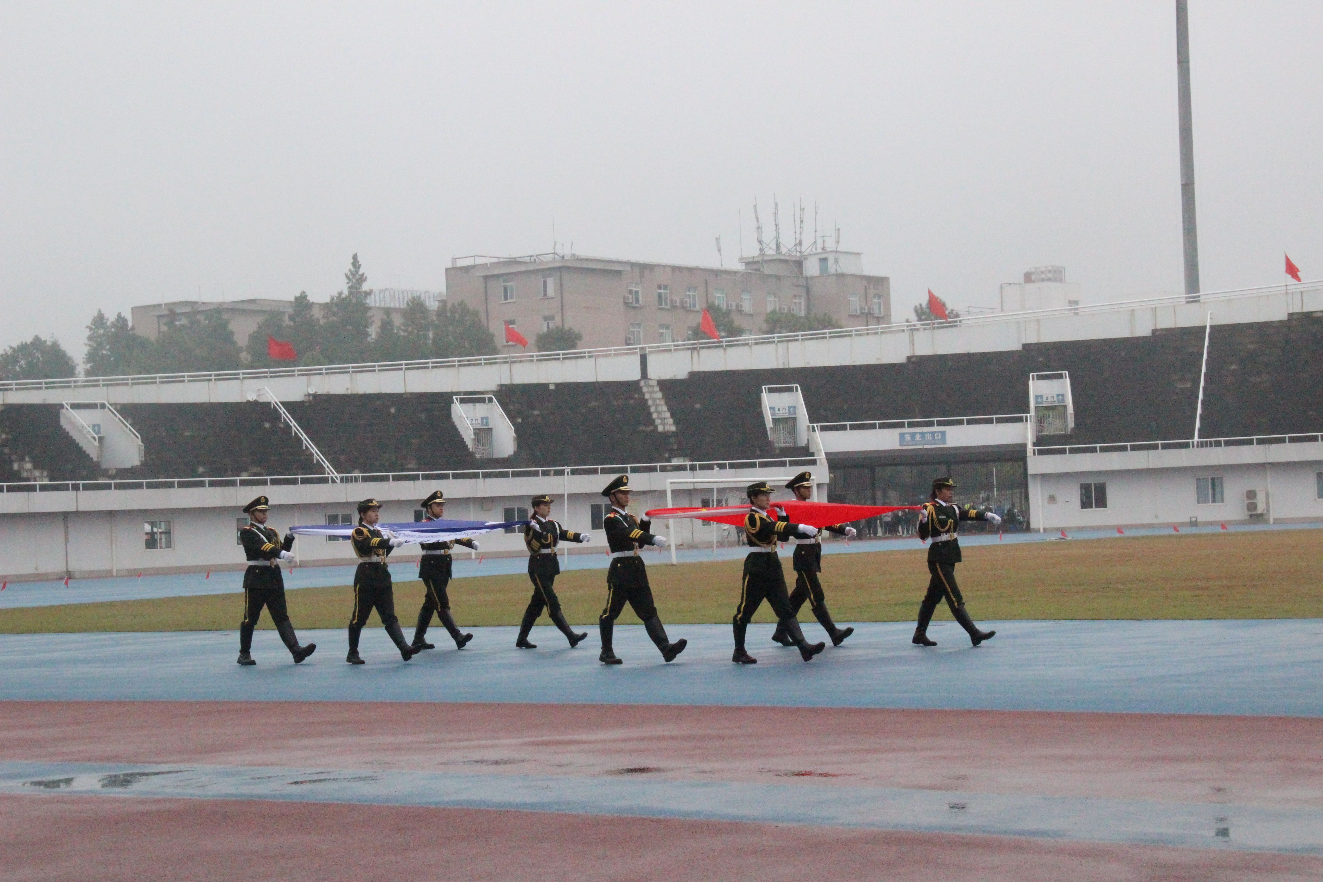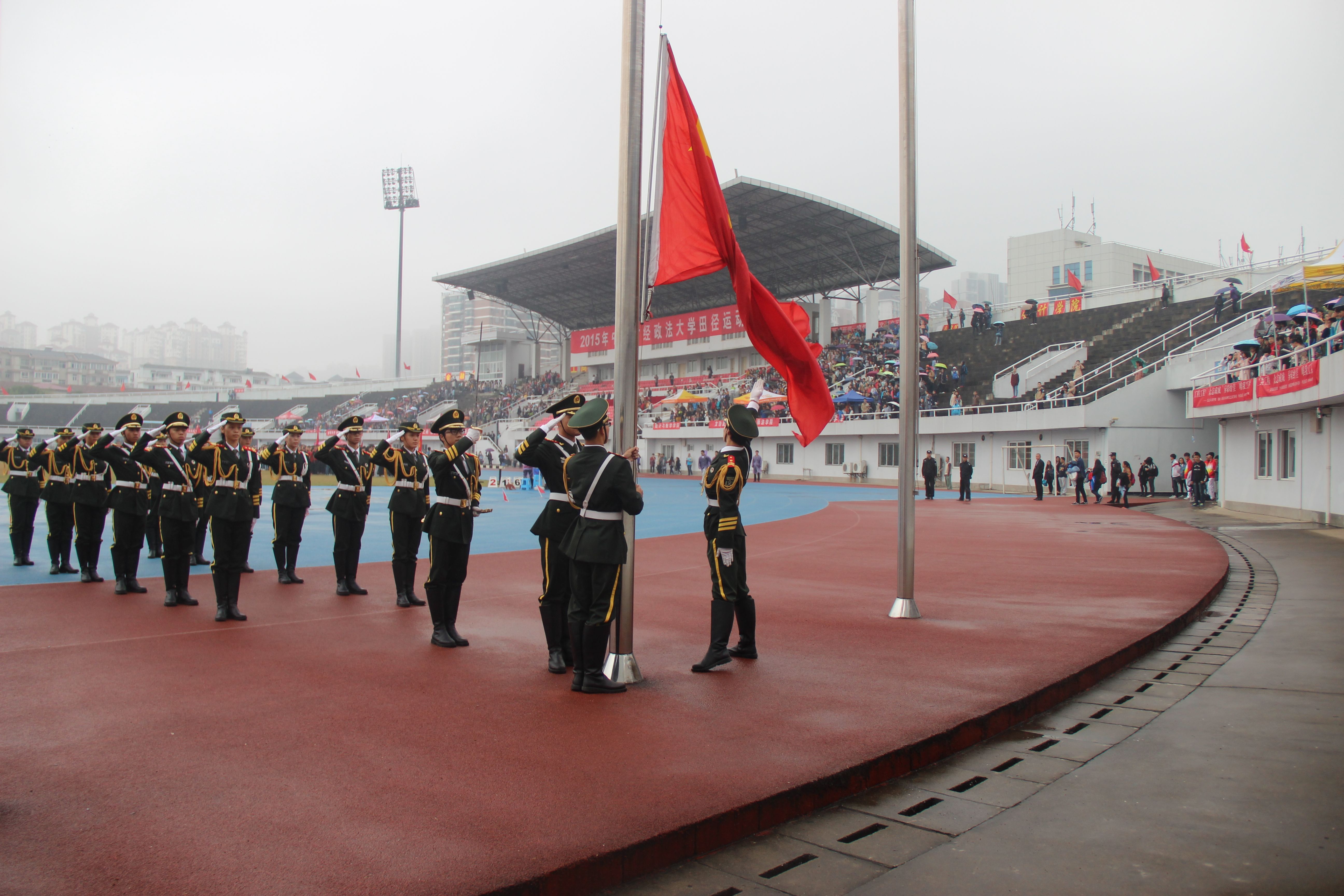 上午8点30分,身着威严军礼服的国旗护卫队准时出现在新体。伴着庄重的奏乐声响,鲜艳的五星红旗和中南财经政法大学校旗在队员的护卫下缓缓前行。雨越下越大,队员们步伐却依旧整齐划一;风越刮越猛,队员们口号依旧铿锵响亮。他们精彩的表现,博得了全场的热烈掌声,更触动了每一位同学诚挚的爱国心。