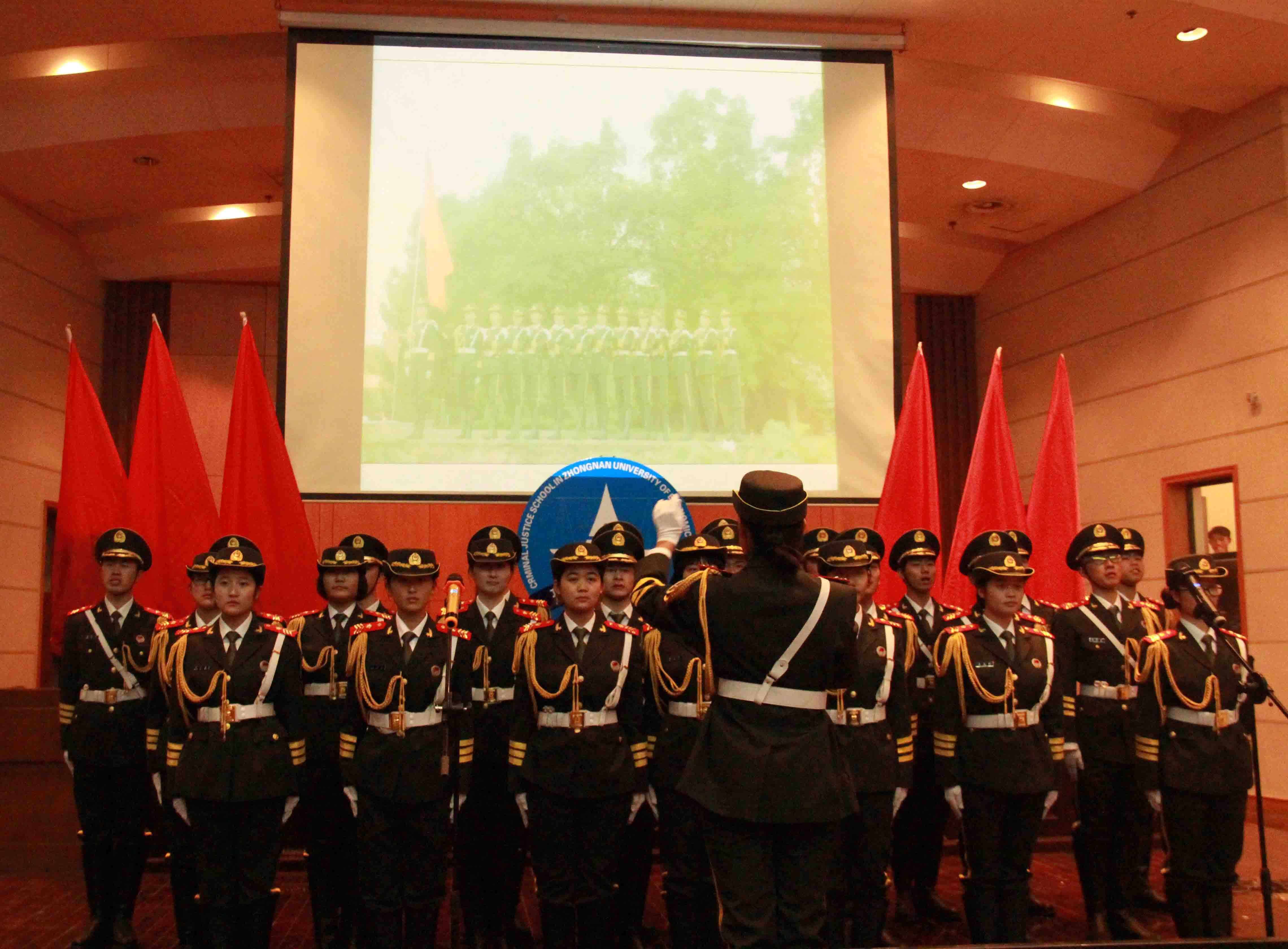 在主持人的介绍完毕以后,边管班带来今晚的首秀歌曲《国际歌》,歌声嘹亮,唱出人民军队的战斗理想。司法1502班不甘示弱,以铿锵有力的朗诵与歌曲《在太行山上》惊艳全场。随后,治安班用一曲《中国人民解放军军歌》将全场的气氛推向高潮,极具感染力的朗诵更让全场油然而生“我骄傲我是中国人”的自豪感!