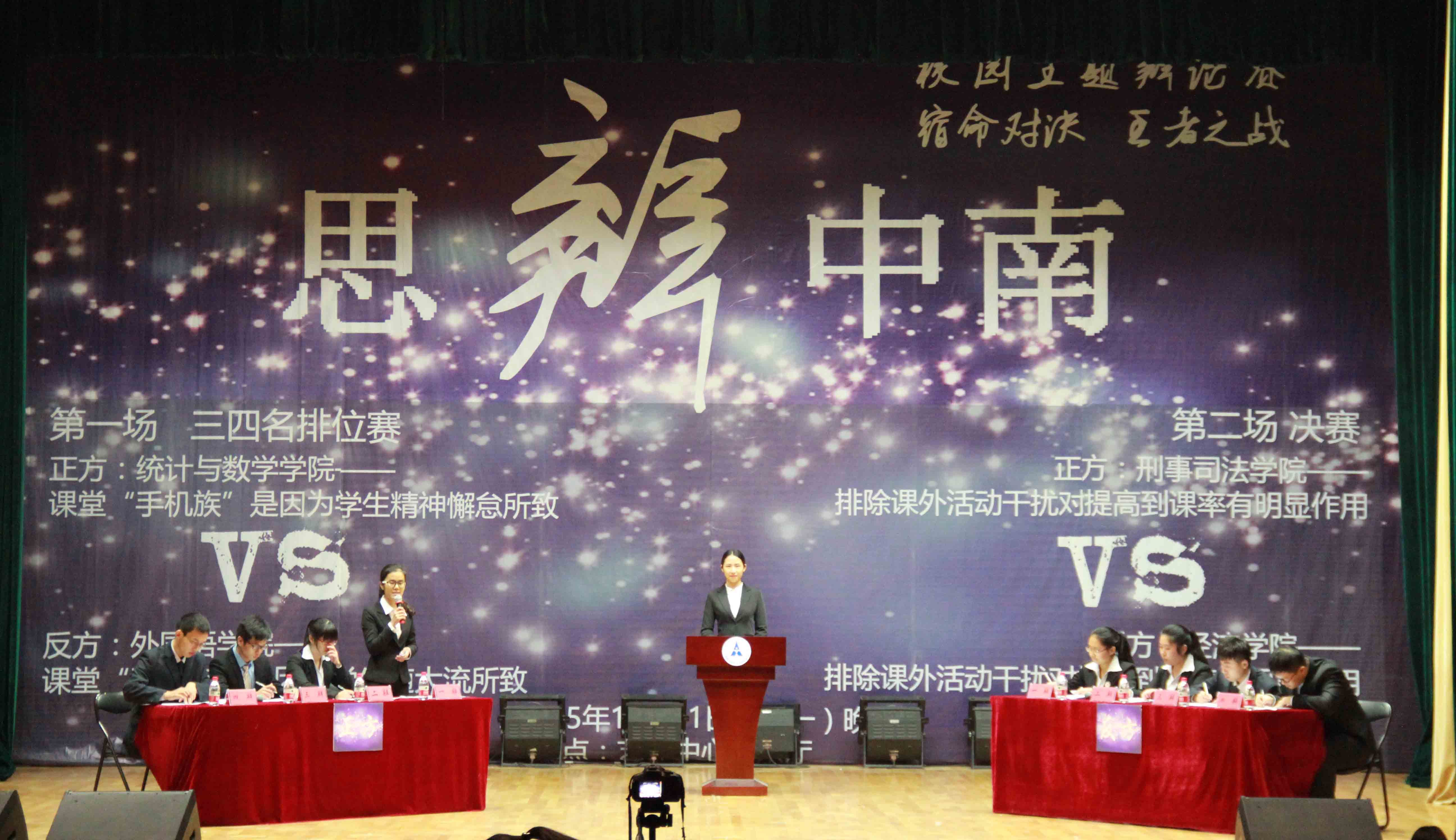 本次辩论的辩题为排除课外活动干扰对提高到课率有无明显作用。比赛一开始,我院一辩汪蒙奇便娓娓道来,向对方辩友、裁判及观众清晰地表述了我方观点。我方主张:第一,采取多角度多层次地措施排除课外活动干扰能够对提高到课率产生立竿见影的效果。第二,只有排除课外活动干扰,帮助大学生树立正确的学习观念,才能对保证到课率起到长远作用。在对方一辩陈述完观点之后,我院二辩孙斯佳以犀利的言辞指出了对方的逻辑及语言错误,铿锵有力,充分反驳了对方观点。在盘问及自由辩论环节,我方三辩秦建航凭借其良好的口才、严谨的逻辑将对方节节击退,三位辩手的精彩辩论也将比赛推向了高潮。最后,四辩邓坤在论题的基础之上探讨了排除课外活动的意义,更深层的挖掘了本次论题的价值。