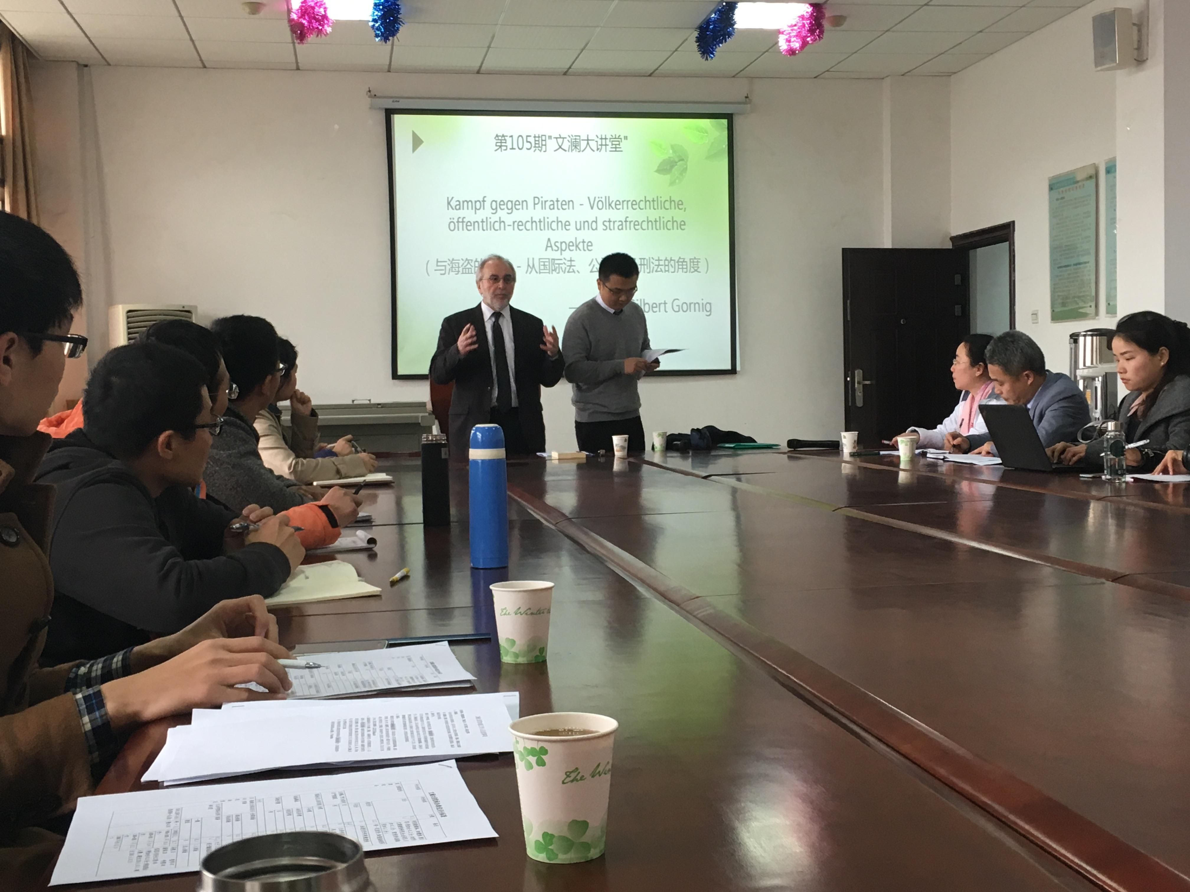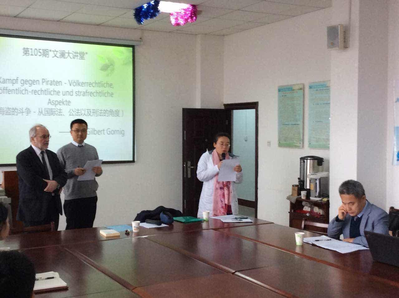 为拓宽广大研究生学术研究的视角,提高在校研究生学术研究的平台,2015年3月23日下午,由研究生院、党委研究生工作部,刑事司法学院主办、我院研究生会承办的第105期“文澜大讲堂”在文治楼二楼会议室正式拉开帷幕。本次讲座邀请了来自德国马尔堡大学的Gilbert Gornig教授,我院副院长苏彩霞教授、副院长童德华教授分别作为主持人和嘉宾莅临本场讲座,青年教师张正宇老师实时翻译。