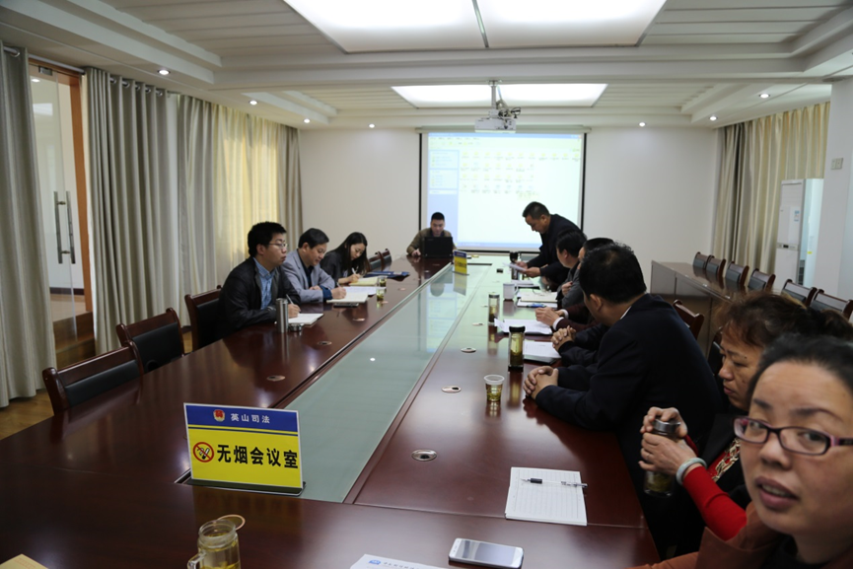 4月18日上午9点,调研组在英山县司法局7楼会议室参加了“推进湖北公共法律服务体系建设”的调研座谈会。会议开始,英山县司法局党组书记、局长尹定计首先代表英山县司法局对调研组的到来表示热烈欢迎,并逐一介绍局领导班子全体成员与各科室负责人。胡向阳院长介绍了调研组成员,并向英山司法局赠送了我院宣传册。接着按照会议议程,司法局各分管副局长(主任)就各自分管的工作进行了介绍,并提出针对性意见和建议。之后律师代表发言,着重阐述了国资律师事务所的尴尬境地。随后,司法局党组书记、局长尹定计进行了总结,他指出公共法律服务体系建设应当依章办事、有人办事、有钱办事。接着调研组观看了运用“三会一体”化解矛盾纠纷的案例视频。互动环节,双方就推进湖北公共法律服务体系的顶层设计、人员培训、资源配置等问题进行热烈的讨论。