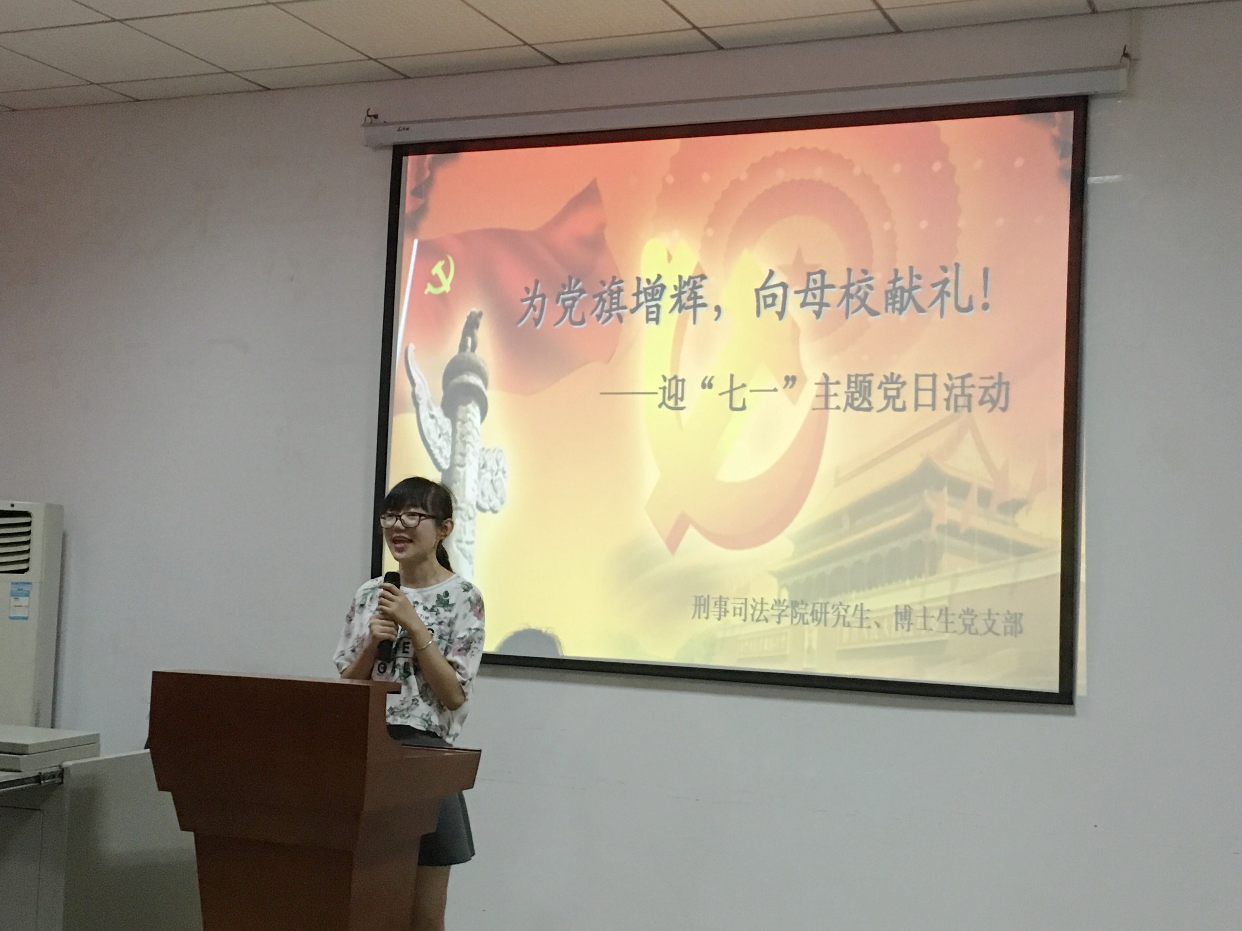 为了迎接“七·一”中国共产党建党九十五周年,以实际行动践行“两学一做”学习教育要求,增强党员同学的责任意识和使命感,我院全体研究生党员于2016年6月22日晚在文治二楼会议室举办了“为党旗增辉,向母校献礼”的主题党日活动。