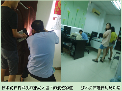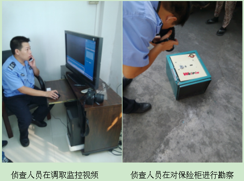 司前派出所王警官立即对现场进行拍照固定,并保护现场阻止无关人员进入。王警官立即通知江门市公安局刑警队派人勘察现场,同时访问相关人员昨天晚上和最近的一些问题,王警官在厂领导的陪同下查看财务室前面的监控视频,发现有两个作案人于7月31日凌晨1时46分进入财务室,大约15分钟后一个嫌疑人扛着保险箱向厕所走去,另一个嫌疑人跟在后面。