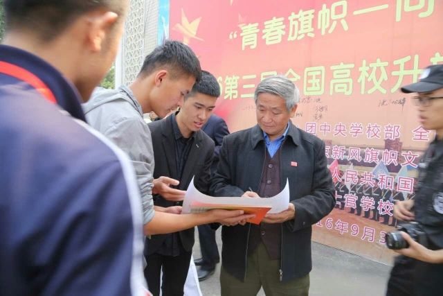 第三届全国高校升旗手交流展示颁奖典礼于10月1日在北京某军校驻地顺利开展,朱德总司令外孙、全国政协委员、解放军装备学院原副院长刘建少将,红二方面军老红军李立之子、解放军信息工程大学原副校长何继明少将,装备学院昌平士官学校校长梁卫东大校,装备学院昌平士官学校政委张勇大校,国防大学军训办副主任陈洲辉大校,军训办程社明大校,清华大学武装部长兼北京高校国防教育协会秘书长熊剑平,天安门国旗班第一任班长董立敢出席颁奖典礼。