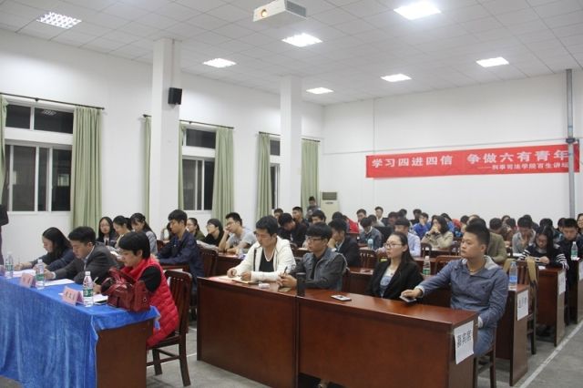 (通讯员:孙红晔辛高尚安康惠)为积极响应校团委号召,进一步推进以“四进四信”为主题的百生讲坛活动,10月14日晚七点,我院于文清楼会议室开展百生讲坛系列活动精彩作品展示以及理论学“习”我来讲演讲比赛。我院党委副书记向前、学办主任黄文菊、院团委书记陆薇老师出席本次活动并担任评委。