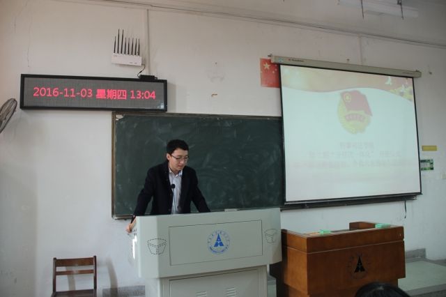 培训课伊始,本次活动的主讲人庞万腾进行了以“识祖国地理,存家国我心,传爱国精神”为主题的讲演。庞万腾讲到,要认真领会党的十八届六中全会精神,更加紧密地团结在以习近平同志为核心的党中央,更加自觉地使自己在思想上行动上与中央保持高度一致。庞万腾的演讲深入浅出,普及了党团知识,讲述了中国地理边境状况,阐述了对祖国无限的爱。向15级学生干部们传递了深深的爱国情怀,并热切希望新一届学生干部在思想上行动上积极发展落实“四进四信”精神。