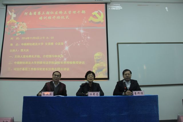 11月5日上午,河南省第三期社区矫正管理干部培训班开班典礼在文清楼四楼会议室举行。出席典礼的嘉宾有河南省司法厅基层工作指导处处长汪奇志同志,我院副院长董邦俊教授及河南省各级社区矫正司法工作者。培训中心主任曾大庆老师主持了本次开班典礼。