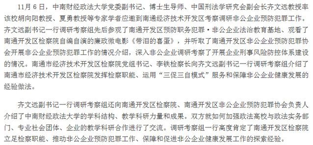 中南财经政法大学党委副书记齐文远一行应邀考察调研南通非公企业预防犯罪工作