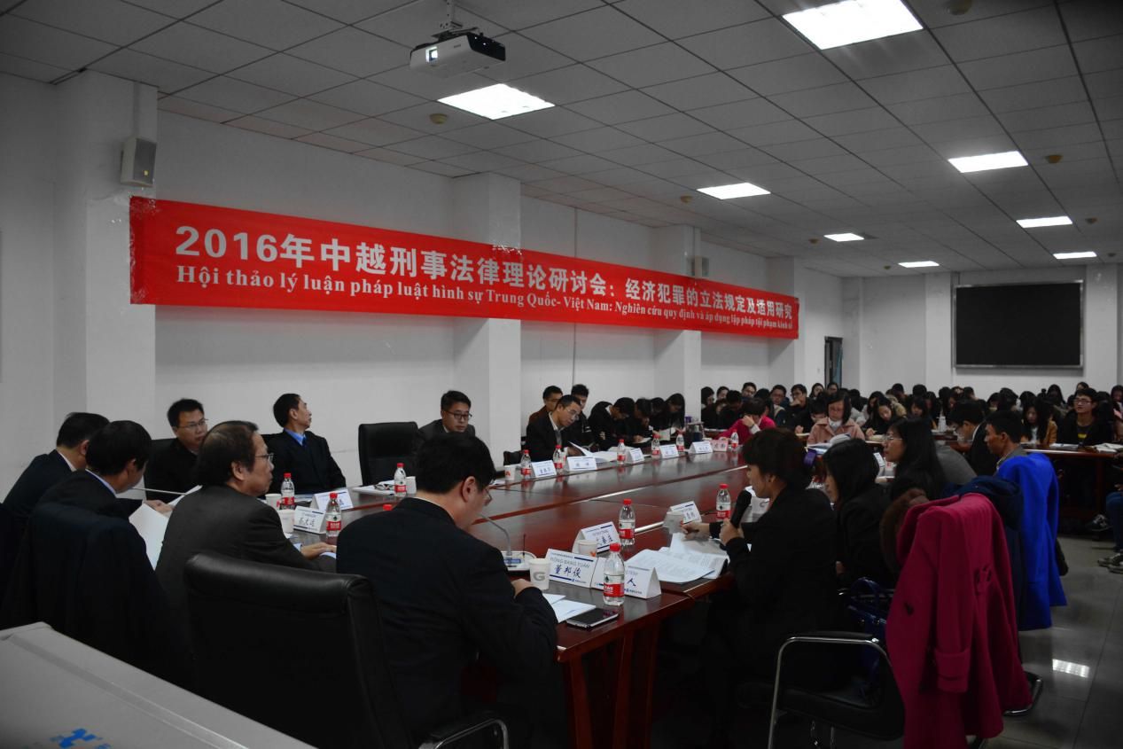 本报讯(学生记者 陈家希 通讯员 何长春)12月21日,“2016中越刑事法律理论研讨会:经济犯罪的立法规定及其适用研究”在南湖校区文治二楼会议室举行。越南河内法律大学副校长张光荣教授及越南人民警察学院法学院副院长黎忠坚博士等诸位越南学者参会。我校党委副书记、中国刑法学会副会长齐文远教授,我院院长胡向阳教授,前院长夏勇教授等多名专家学者出席了会议?;嵋橛晌以焊痹撼ざ羁〗淌谥鞒?。