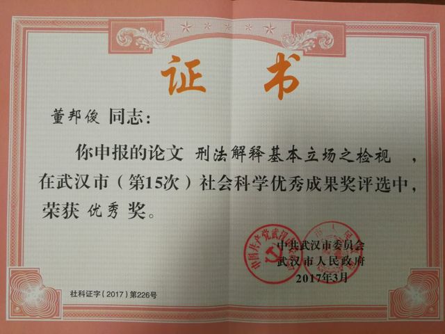 在武汉市(第15次)社会科学优秀成果奖评选中,我院董邦俊教授申报的论文《刑法解释基本立场之检视》,荣获优秀奖。