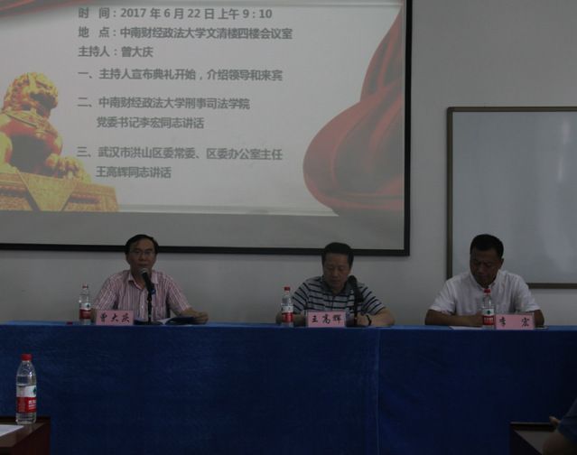 (通讯员:黄卓成 魏泽宇)2017年6月22日上午9点,武汉市洪山区领导干部法治专题培训班在文清楼四楼会议室顺利开班。我院党委书记李宏,洪山区委常委、区委办公室主任王高辉等多名干部出席本次培训班开班仪式,开班仪式由我院培训中心主任曾大庆老师主持。