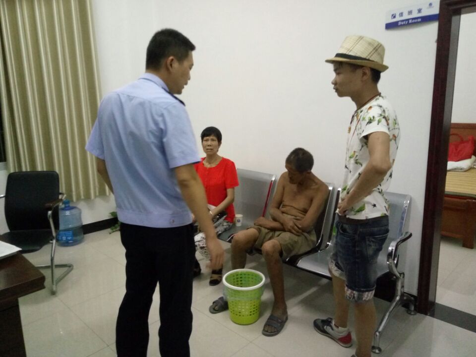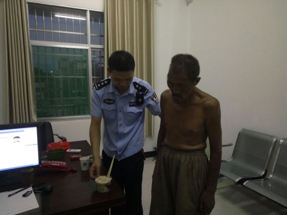 民警到达现场后,发现老人右脑有明显的凹陷,上身未穿衣服且身上沾满了泥沙,一副失魂落魄的样子,与其交谈,老人只自顾自的说一些不着边际的话语,且发音浑浊,很难听懂。眼看天色将晚,天气又十分阉人,老人精神状态很不好,民警遂先将老人带回派出所,为其打开空调,倒上茶水,并为其端来一碗米饭,待老人精神慢慢回转后,民警耐心问询其情况。