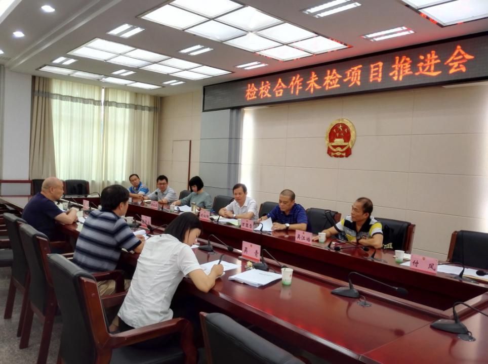 8月4日上午,中南财经政法大学刑事司法学院与黄冈市检察院检校合作未检项目推进会在黄冈市检察院顺利举行。黄冈市检察院魏竟成副检察长、李再波副检察长、未成年人检察处吴青处长、法律政策研究室汪辉主任等领导,以及我院院长胡向阳教授、党委副书记万里雪、院长助理舒玲华副教授、吴江皓副教授、付凤副教授,项目合作单位武汉烽火通信科技股份有限公司杨旭升经理等参加了本次推进会。会议由李再波副检察长主持。