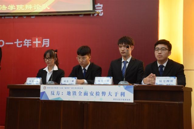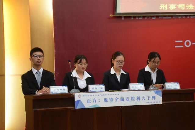 (通讯员 雷盼 杜诗宇 安逸群)10月28日晚7时,首义校区文汇楼MBA报告厅内,我院新生辩手就“地铁全面安检是弊大于利还是利大于弊?”这一辩题展开激烈角逐。我校往届优秀辩手谢逍、孙紫瑞、李子宣、杨佳伟,华中科技大学辩论社社长陈明静、中南民族大学辩论队队长叶晓丹以及校演讲与辩论协会会长、本次决赛辩题出题人诸葛清坐镇评委席,刑事司法学院分团委书记卓张鹏老师、17级辅导员郭青川老师出席本次活动。