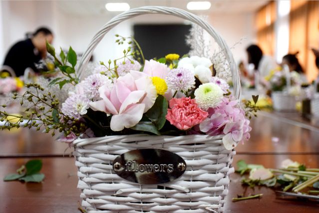 插花师首先介绍了插花工具、插花耗材和花材,在场的老师们认真了解了各种材料的用途、各种花的特点,随后便开始了插花的实操阶段。先是浅色绣球花包边装饰,尤加利叶绿色点缀,粉、白玫瑰静立篮中,“粉红色的秋天”的主题呼之欲出。嫩黄、洁白的雏菊犹如星星点点,康乃馨辅以一抹鲜艳的粉红……在插花师的讲解和指导下,心灵手巧的女老师们各有发挥,用相同的花材插摆出不同的美丽,在花篮中绽放。
