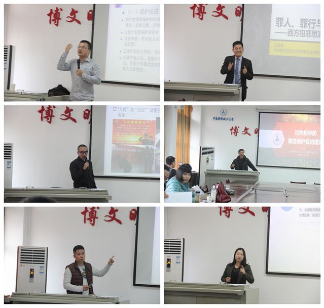 比赛中,六位老师分别配合自己精心制作的课件做了精彩的讲授。其中张正宇老师和王敏敏老师分别讲授了取得性财产犯罪中的共识性知识和危险驾驶罪的概念及构成要件,将枯燥的书本知识与多个案例结合,使原本生硬的法律概念生动化、具体化;周睦棋老师讲授了警察现象与社会形态;袁建伟老师以上海摔孩案为例详细讲述了警察?;补叵档拇恚醺创豪鲜νü晕鞣椒缸锼汲钡幕毓擞肷笫永唇彩谧锶?、罪行与犯罪互动;李波老师重点讲授了过失犯罪中的规范目的理论。老师们有对概念的深入剖析,同时也联系了典型案例以及社会热点;既生动形象,亦不失严谨。