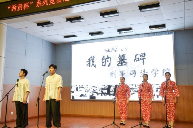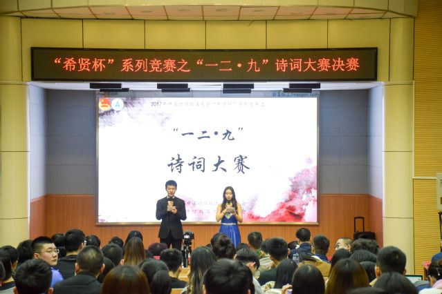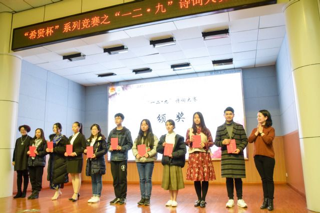 新闻网讯(学生记者 郭茜)12月9日下午2:30,“希贤杯”系列竞赛之“一二?九”诗词大赛决赛在南湖校区文潭楼拉开帷幕,我院主持朗诵团赵俊皓、周博惟、王涵聪、翟希冉、朱成携手演绎朗诵节目《我的墓碑》。本次比赛分为四大环节,分别是嘉宾介绍环节、各学院朗诵表演环节、嘉宾点评环节以及颁奖环节。