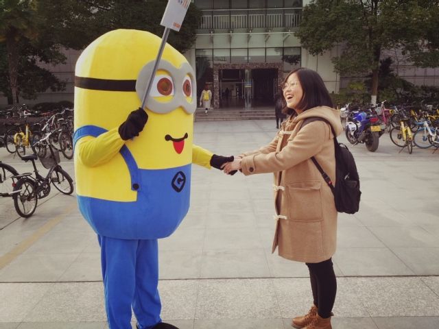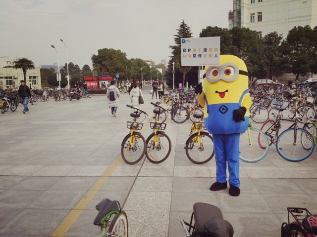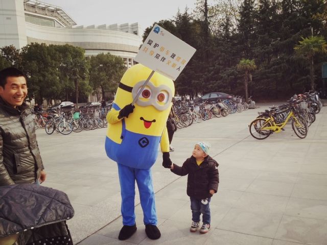 本次活动,刑司志协的志愿者们身着动画角色小黄人的玩偶服装,手举印有号召大家文明停车的标语牌,在文泰楼前的自行车规范停车区进行“查岗”。看到同学们有不文明停车举动,“小黄人”立刻上前劝阻,并引导他们有序停车。有路过的师生和居民主动上前要求与“小黄人”合影,志愿者们就邀请他们一起摆放乱停乱放的共享单车。在志愿者们的努力下,文泰楼前自行车规范停车区内的共享单车摆放得井井有条,新奇的玩偶交警形象也引得路人纷纷驻足围观并加入到摆放单车的大军中来。