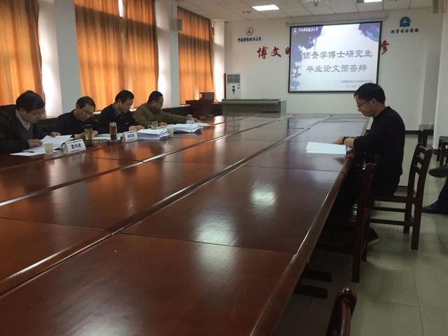 1月13日下午2点,2018年(上)侦查学博士生预答辩在我院文治楼二楼会议室举行。此次预答辩旨在审查博士学位论文初稿,发现其中存在的问题和不足,便于博士学位申请人及时修改和完善论文。此次预答辩活动由博士生导师杨宗辉教授担任答辩委员会主席,胡向阳教授、董邦俊教授和董少平教授担任答辩委员会委员。