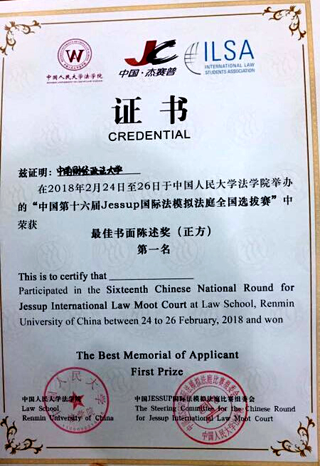 新闻网讯(学生记者 覃曦菡)2月26日,在法学院的支持下,以国际法学系邓烈教授为主教练、2016级国际法研究生余璐为助理教练,以刑事司法学院2014级职侦1401班的覃曦菡和法学院2014级本科生纪晓彤、黄盼、2015级研究生罗启越、2015级本科生张傲为队员的我校辩论队,在中国人民大学法学院举办的中国第十六届杰赛普(Jessup)国际模拟法庭全国选拔赛中斩获了“最佳书面陈述奖”第一名,展示了中南学子的风采和“双一流”法学院的实力。今年,一共有来自全国各地的四十九支高校代表队参加竞赛,最佳书状奖共设三名,我校第一次取得该单项奖,并且拿下了第一名的优异成绩。