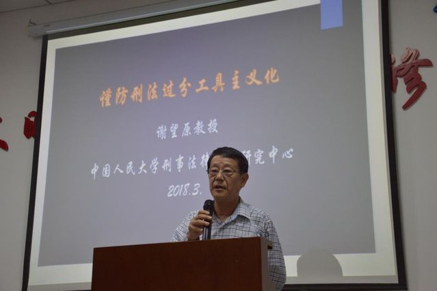 (学生记者吴迪扶亚楠)2018年4月1日晚7时,我院特邀来自中国人民大学刑事法律科学研究中心的谢望原教授在文治楼二楼会议室为我院师生带来题为“谨防刑法过分工具主义化”的讲座。本次讲座由我院副院长童德华教授主持,我院刑法学科带头人齐文远教授出席活动,各年级研究生到场聆听。