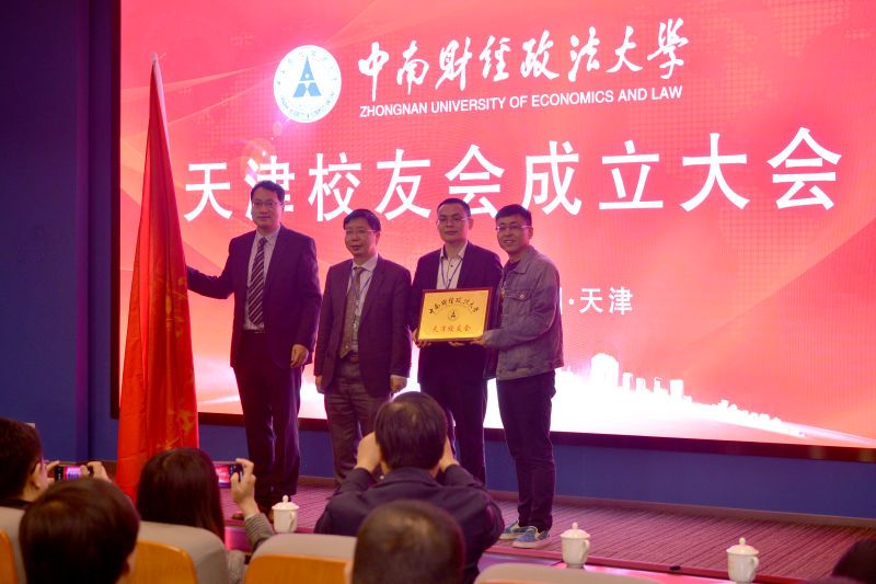 2018年4月22日,中南财经政法大学天津校友会成立大会在天津市滨海新区文化中心举行,中南财经政法大学副校长邹进文、刑事司法学院院长胡向阳、工商管理学院副院长郑家喜等出席大会。本次成立大会共有近200名天津各界校友参加,大会还邀请了复旦大学、山东大学、中央财经大学、中国政法大学、西南财经大学、合肥工业大学、哈尔滨理工大学、东北财经大学、河北经贸大学、山东财经大学、东北农业大学等院校的天津校友会代表以及北京校友会、河北校友会、天津市湖北商会代表等。