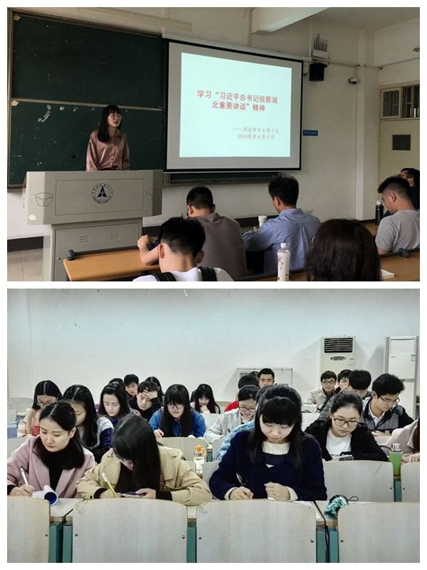 在讨论环节中,2015级刑法学熊彬同学谈到,作为一名即将留汉工作的湖北本地人,应当牢固树立“四个意识”,坚定“四个自信”,充分运用所学知识服务于家乡发展和法治建设。张曼同学表示,毕业后无论何地,做何工作,都应不断提高政治站位,增强社会责任感和历史使命感,尽最大努力为中华民族伟大复兴贡献绵薄力量。2015级侦查学韩桢同学指出,通过此次集中学习,对祖国建设伟大成就认识更为深刻、倍感自豪,更加坚定了党员理想信念,并表示在今后学习工作中要更加积极努力,谨记习近平总书记对青年人的希望,严格要求自己,做一名合格的共产党员。2016级何长春同学结合习近平总书记视察湖北时“创新是新发展理念的第一位”重要讲话精神强调,创新思维不仅对国家和地区发展十分重要,对青年成长成才也至关重要,社会对创新型人才需求量越来越大,要求青年学生敢于推陈出新,发展新思维取得新进步。2017级侦查学陶晨冉同学表示,自身学习情况和实践经验相结合,在以后的生活学习中以身作则,并倡导广大党员同志要积极行动起来,践行党员职责。