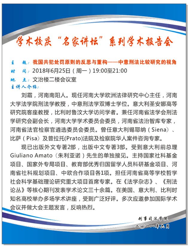 讲座预告:学术校庆“名家讲坛”系列学术报告会——我国共犯处罚原则的反思与重构