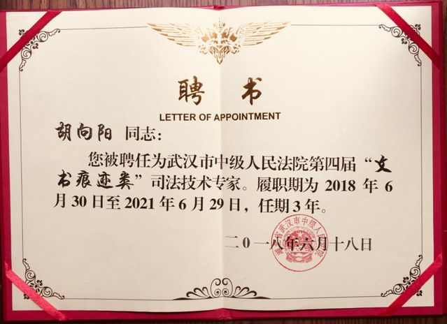 2018年7月3日上午,武汉市中级人民法院在该院十二楼会议室举行了隆重的聘任仪式,我院院长、校司法鉴定中心主任胡向阳教授被聘为文书痕迹类技术专家。