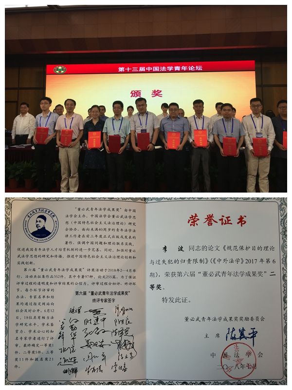 “董必武青年法学成果奖”是由中国法学会主办,中国法学会法治研究所承办,中国法学会董必武法学思想(中国特色社会主义法治理论)研究会协办的部级奖励,面向全国未满40周岁的青年法学法律工作者正式出版或发表的论著,是中国青年法学研究成果的最高奖项。本届终评专家由陈冀平、张文显、王其江等22位法学界权威专家学者组成,在352件作品中遴选出一等奖作品1件、二等奖作品5件、三等奖作品11件、提名奖作品21件。我校李波老师的论文《规范保护目的理论》荣获二等奖。获奖理由为:“规范保护目的理论是实现归责的重要内容之一,《规范保护目的理论与过失犯的归责限制》一文采用客观归责中的规范保护目的理论对过失犯的归责问题做了较为深入的研究。论文提供了一种可资借鉴的限制过失犯归责范围的路径,并且对此做了充分的论证,表明作者具有较为扎实的刑法专业知识和较强的科研写作能力。”