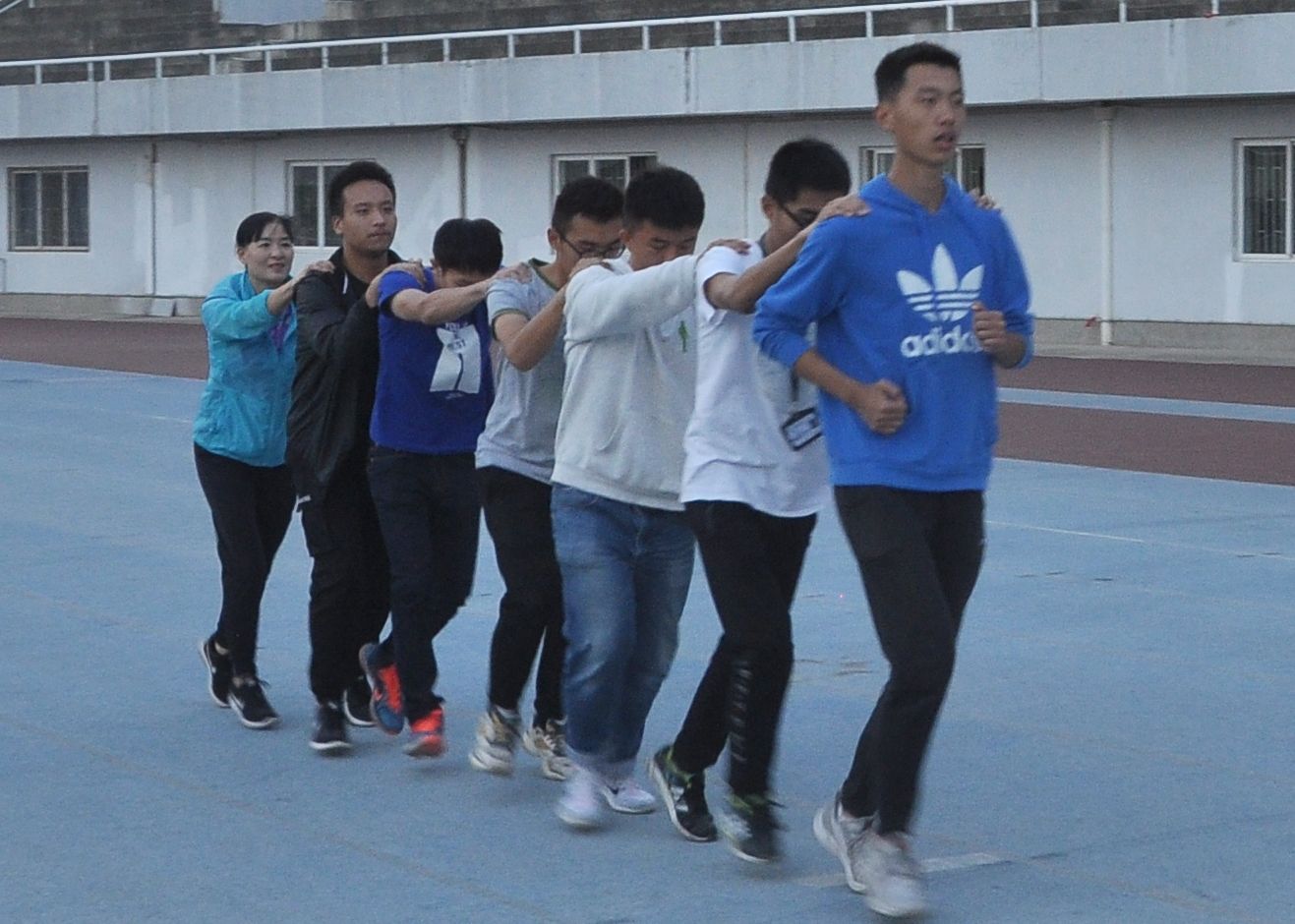 “时代列车”挑战,各组参赛选同学于本赛道的起点线后成一路纵队排好,每位选手将双手依次搭放于前位选手的双肩之上,串接完毕就成为处于稳定的一列待发之“车”。比赛开始,各组选手在车头的带引指挥下,步调一致,结队前行?!耙欢?!一二!”口号声整齐划一。紧张又刺激的活动如火如荼地进行,所有参加成员都深刻体会到团结的重要性,默契度逐渐上升。